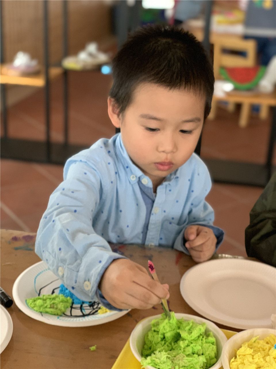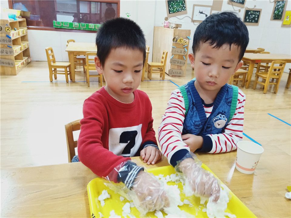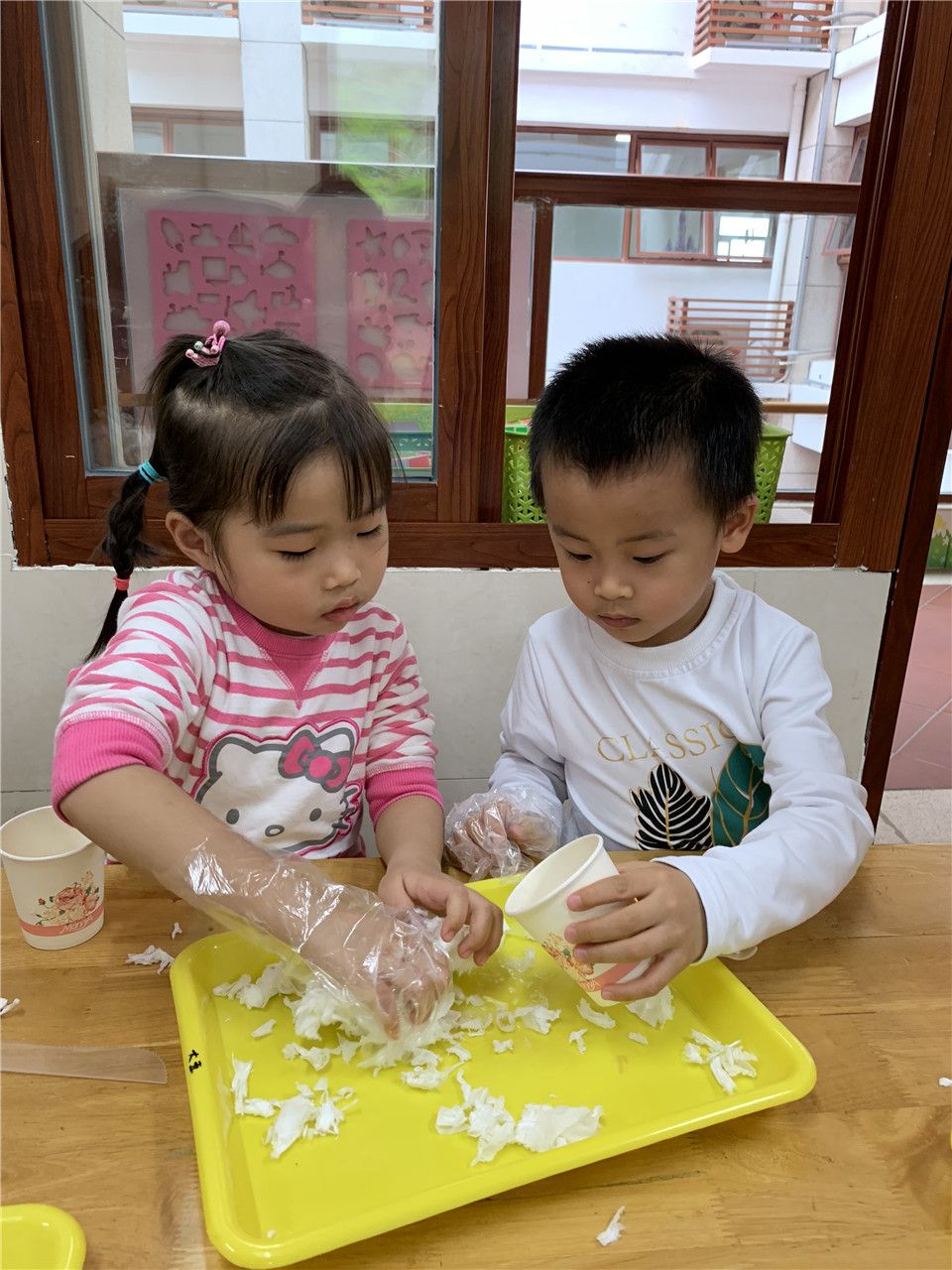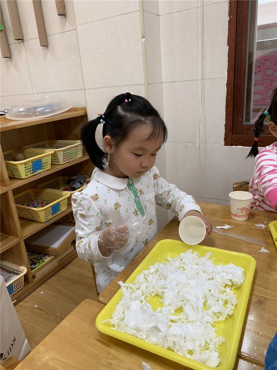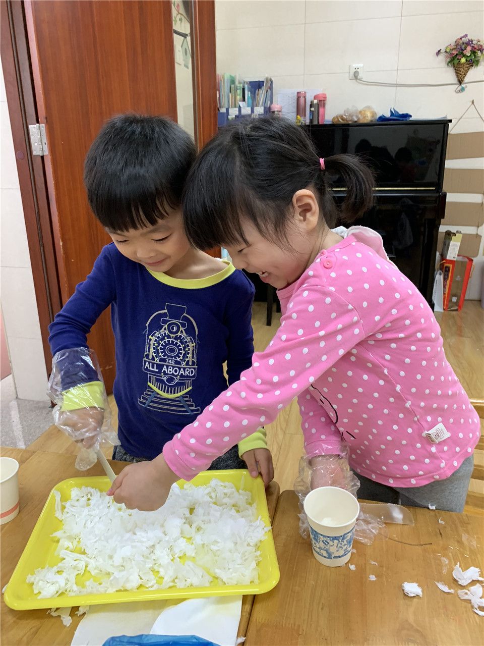 “水也不能太多啦,要不太湿了就不好粘啦。”这可是做纸浆画的关键步骤,小朋友们丝毫不敢怠慢。不一会纸浆就成型啦~