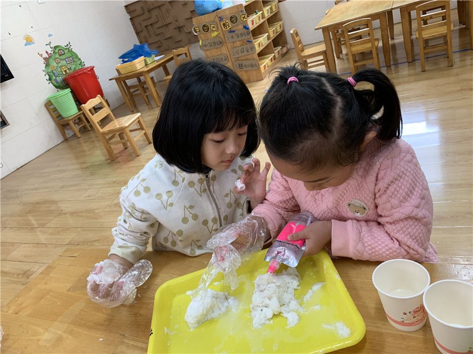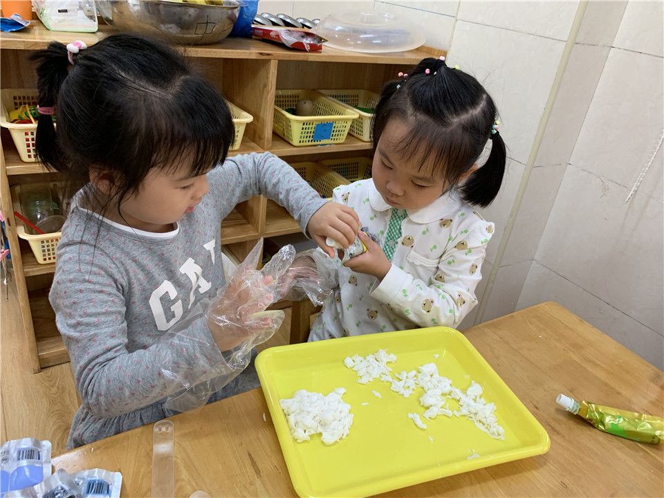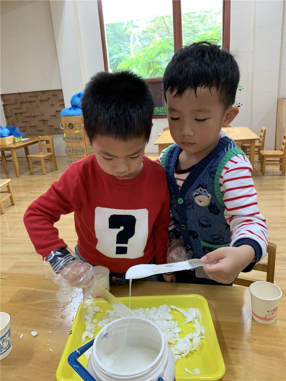 “知道啦。我会小心的。你赶紧用手揉啊。” 来一勺黏黏的白乳胶,再用手揉一揉。让纸浆变得有粘性。