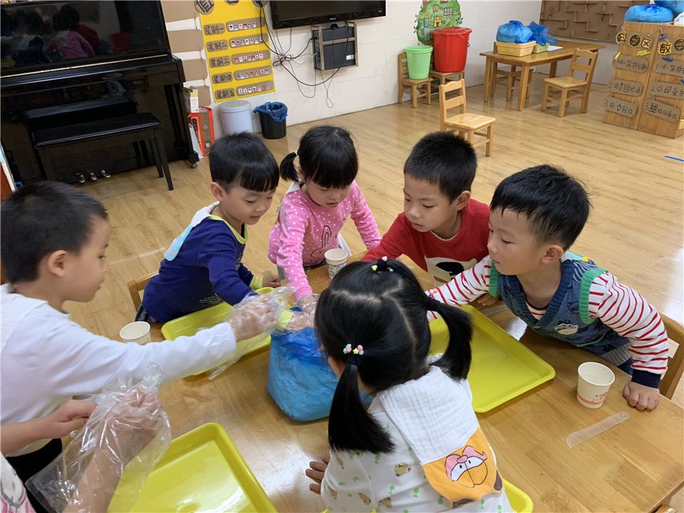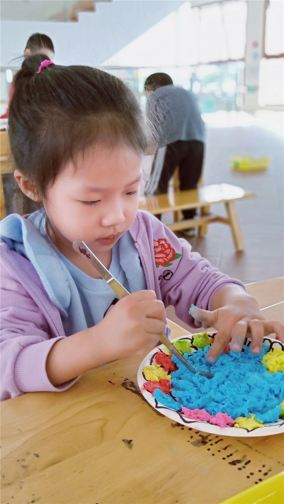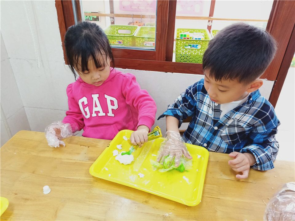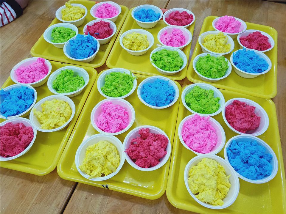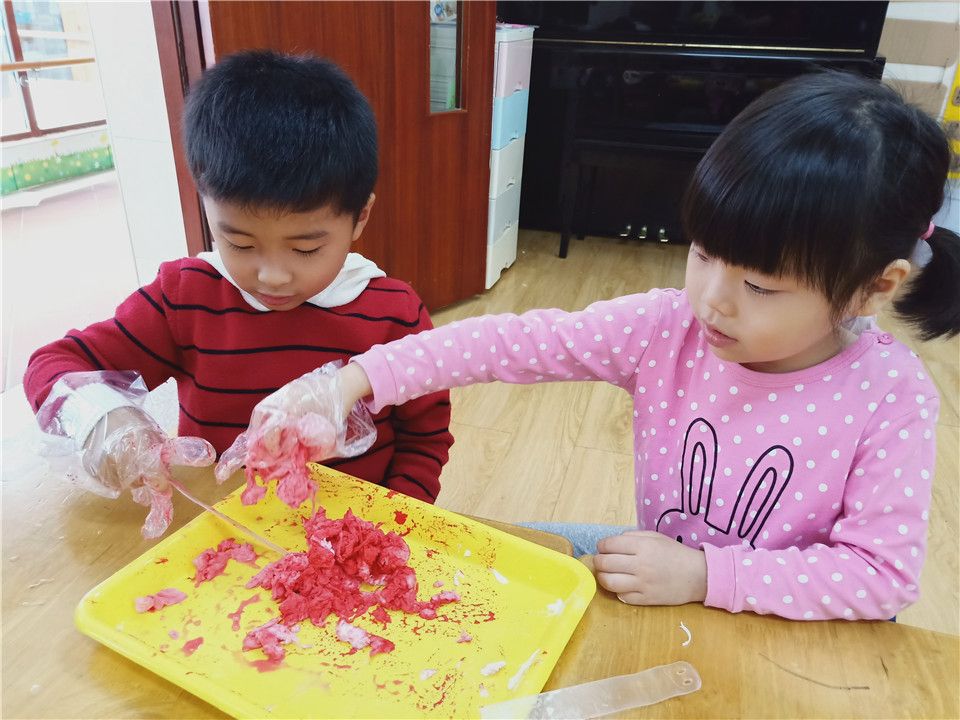 “你快点把颜色揉到纸浆里。”哈哈。不一会儿,白白的纸浆染上了各种各样好看的颜色咯。