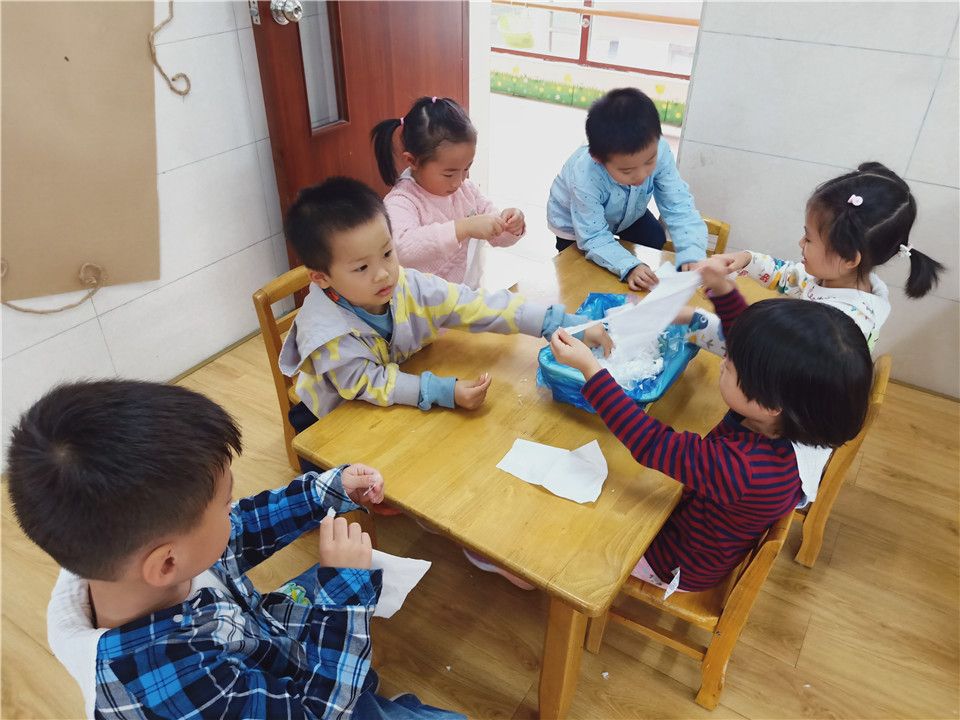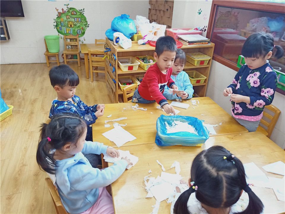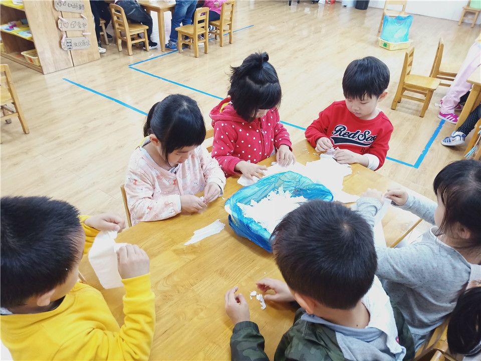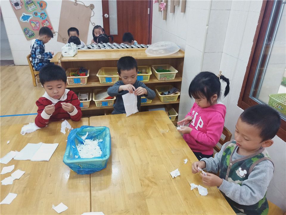 小朋友们拿起软软的抽纸撕啊撕,撕啊撕,撕成了碎碎的小纸块。虽然看过去很枯燥过程很漫长,可小朋友只要想到能用这些碎纸来制作一幅幅美丽的画,个个都乐在其中呢。