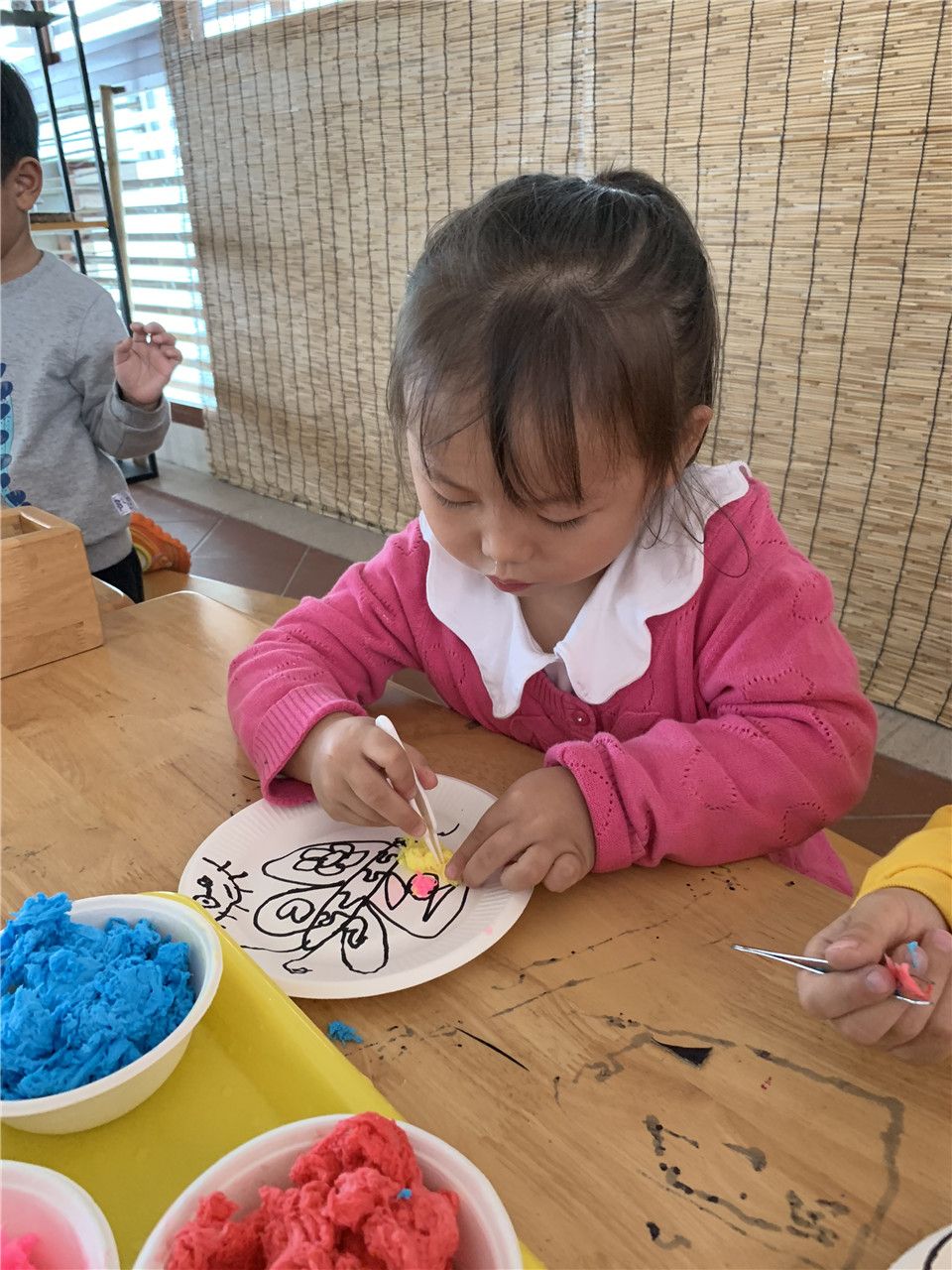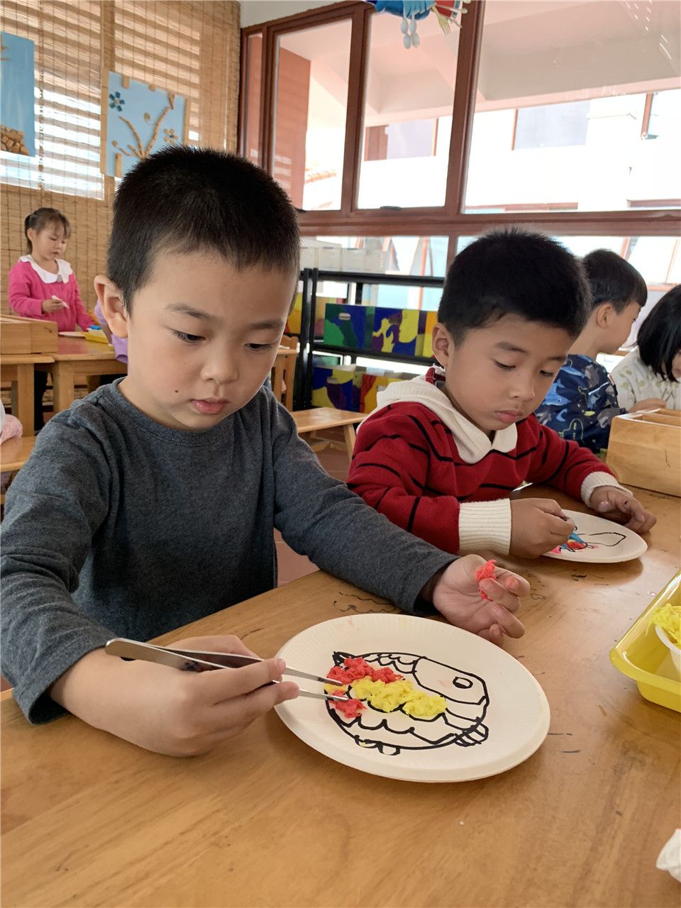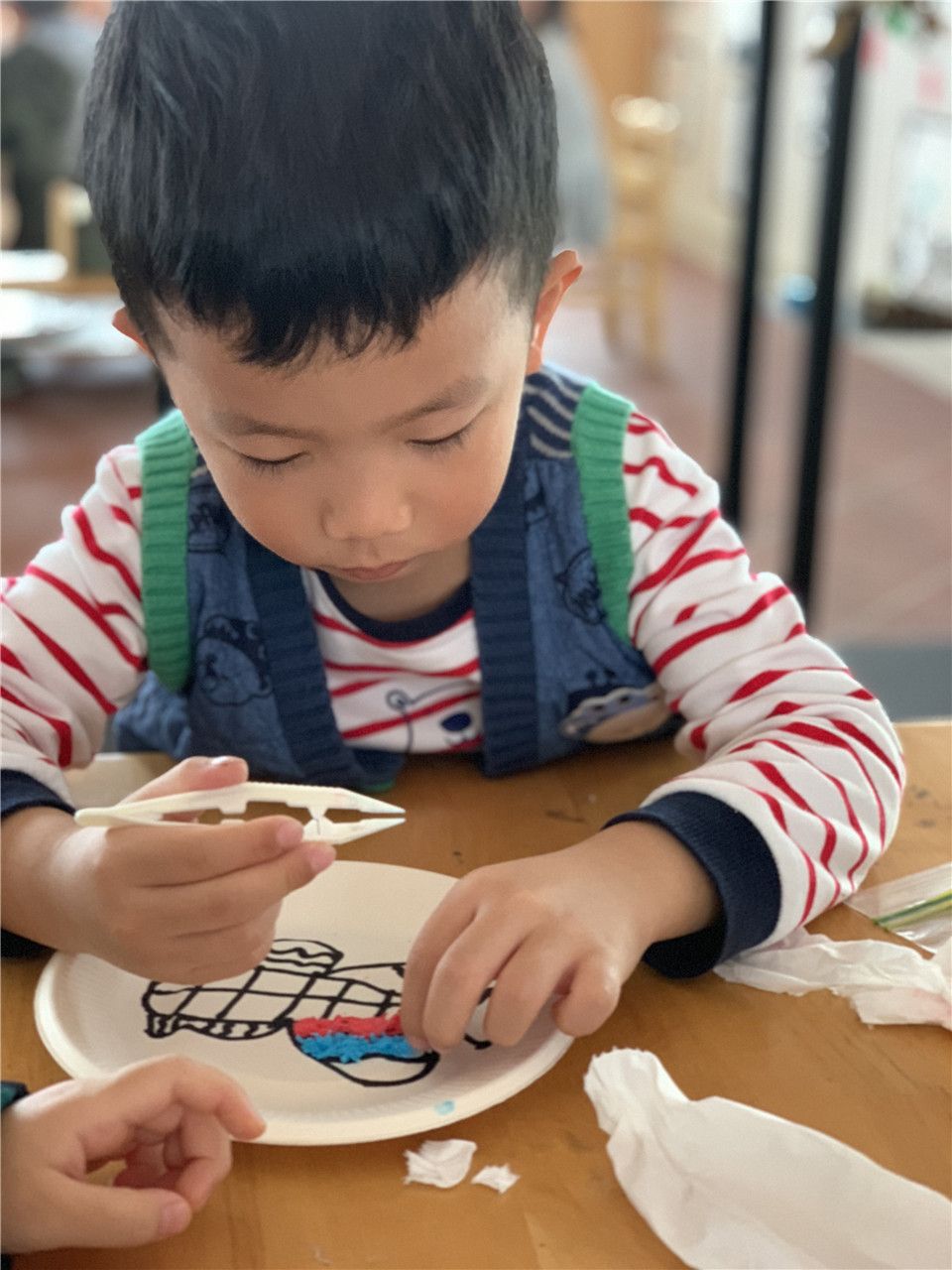 “这个这么大块要怎么办?”“你夹小块的啊,要不你用手帮忙撕小一点。”看看小朋友拿着镊子小心翼翼的夹着纸浆黏贴在自己画好的圆盘上,瞧他们多认真啊。