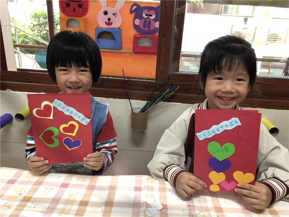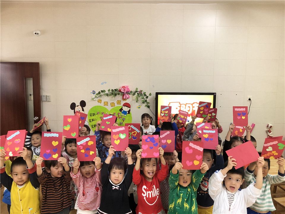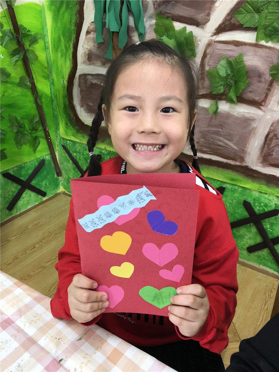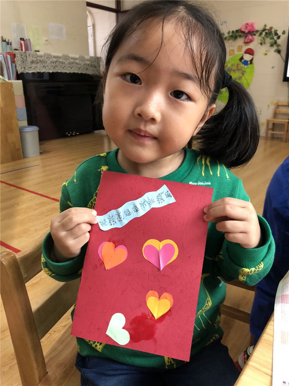 宝贝们手举着亲手做的贺卡,心里美滋滋的,脸上绽放着无比灿烂的笑容。“瞧!我们的贺卡多漂亮,我们一起来合照吧!” “我们要把贺卡带回家咯!”我们一起大声地说出:“祝爷爷奶奶节日快乐,耶!”