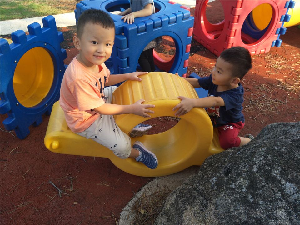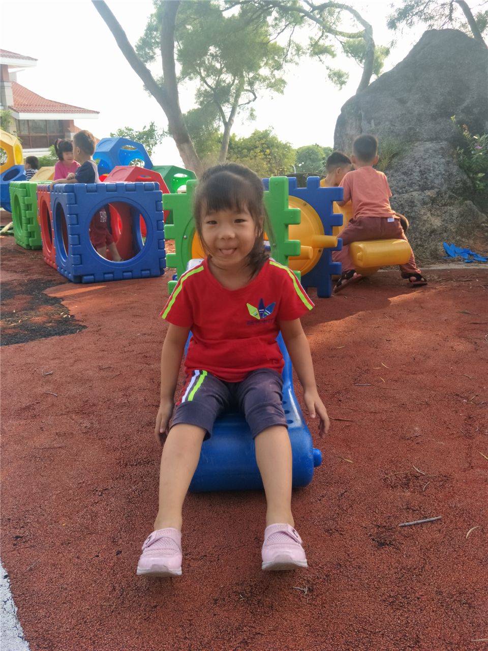 包包:“滑滑梯得快点滑下来,不然堵住出口后面的小朋友就下不来了!”