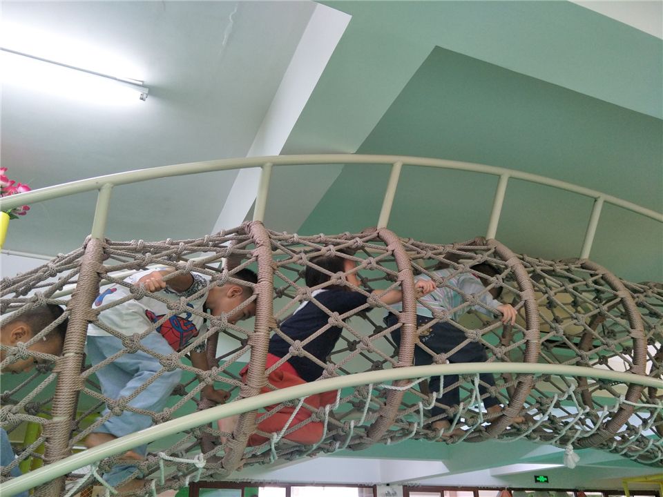 子林:“我们一起爬过这个大渔网,记得要蹲下来小心的扶着两边的大麻绳哦!”