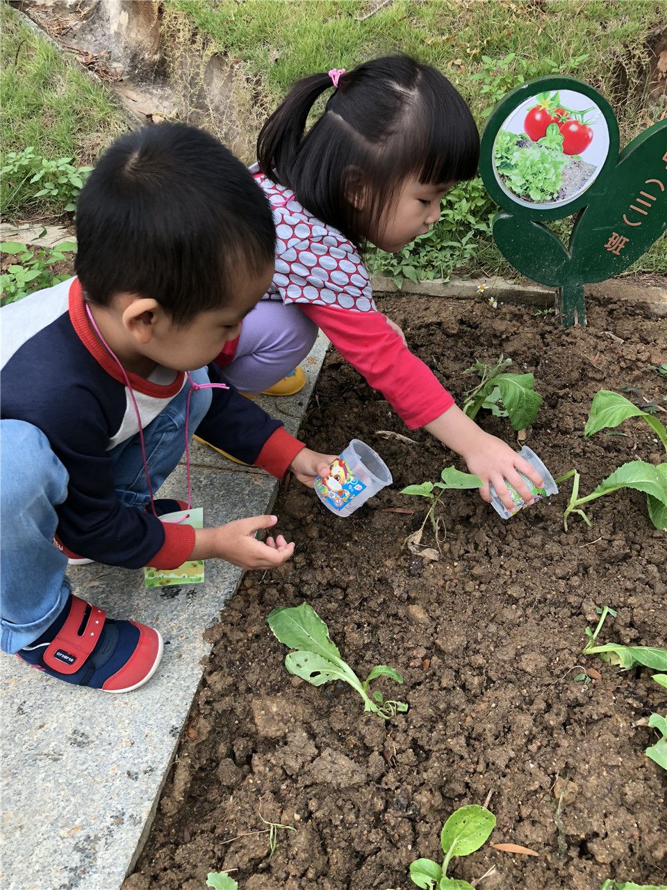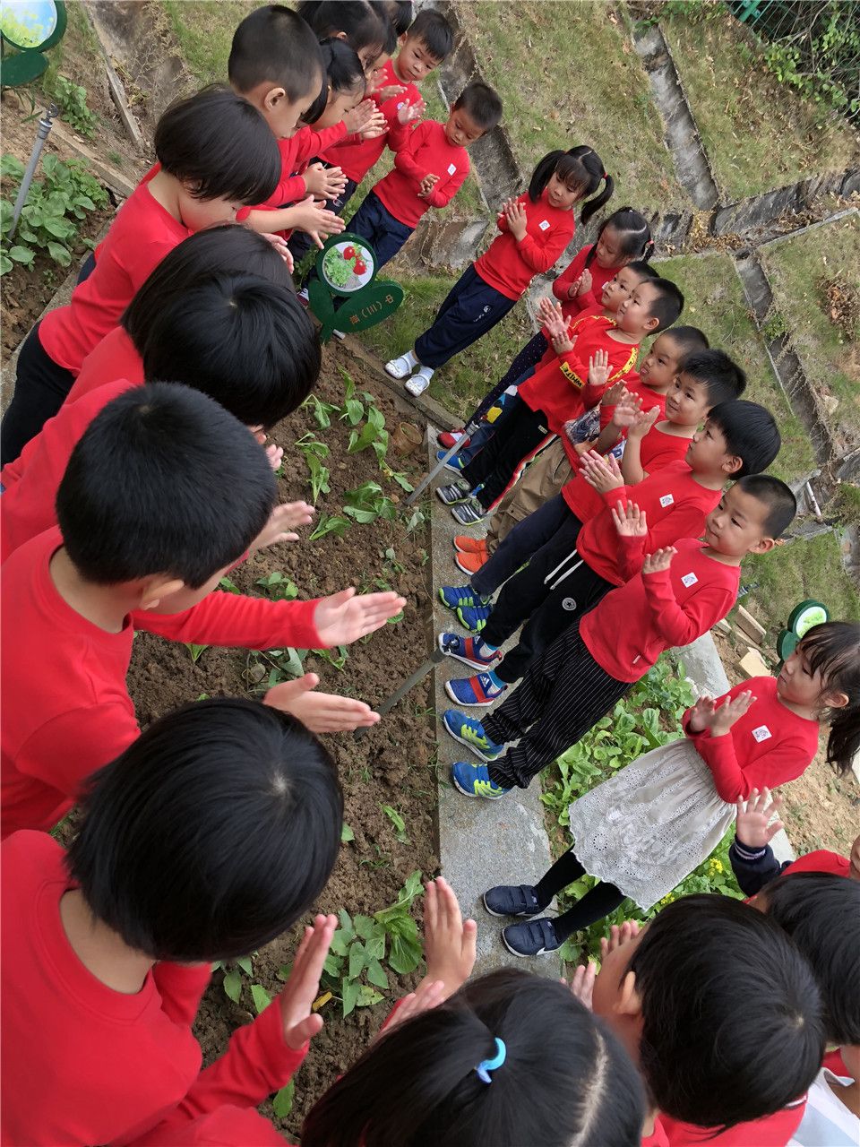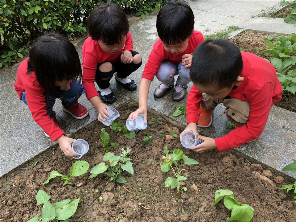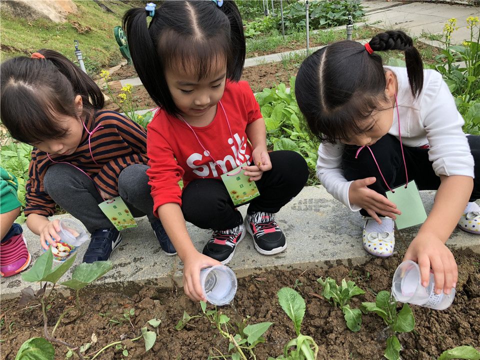 现在老师都会每天安排值日生到我们的菜地里拔草、施肥、浇水,一起保护好小菜苗,让它们快快长大!