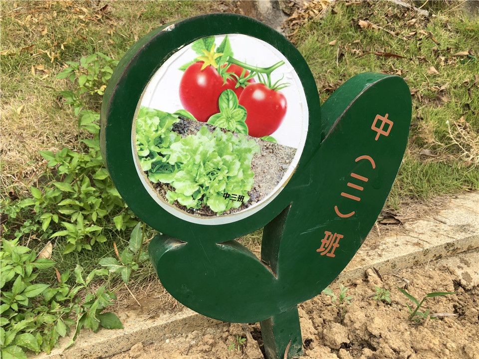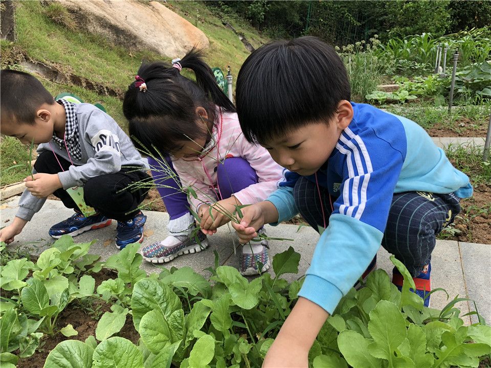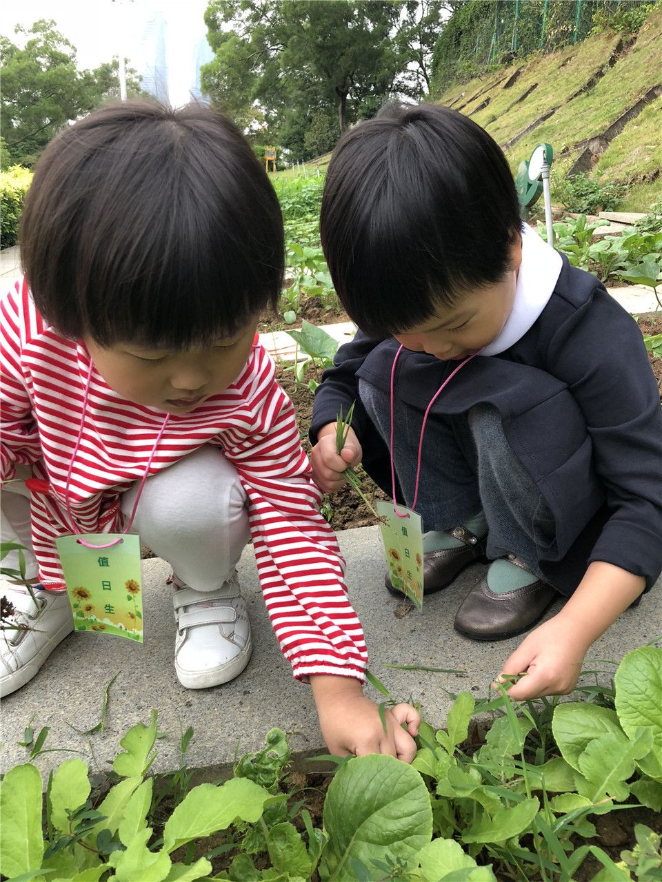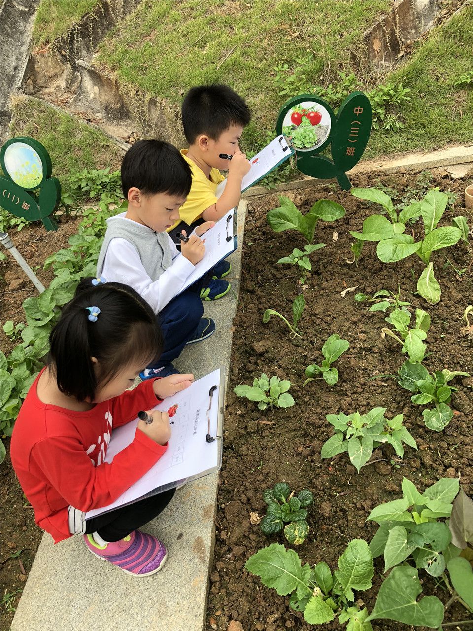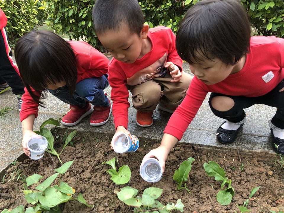 现在老师都会每天安排值日生到我们的菜地里拔草、施肥、浇水,一起保护好小菜苗,让它们快快长大!