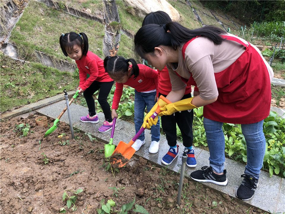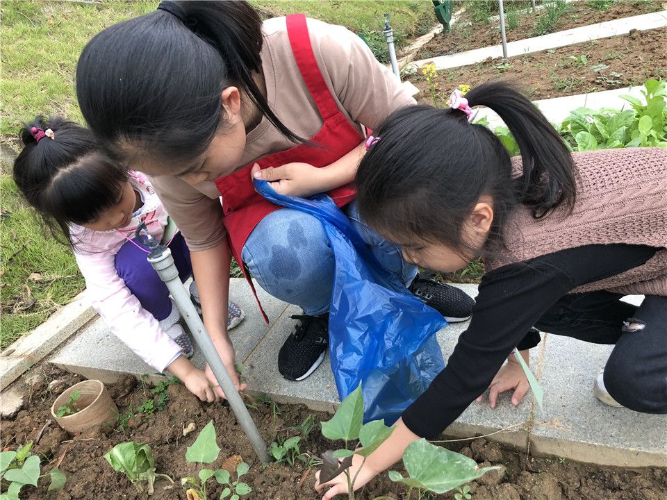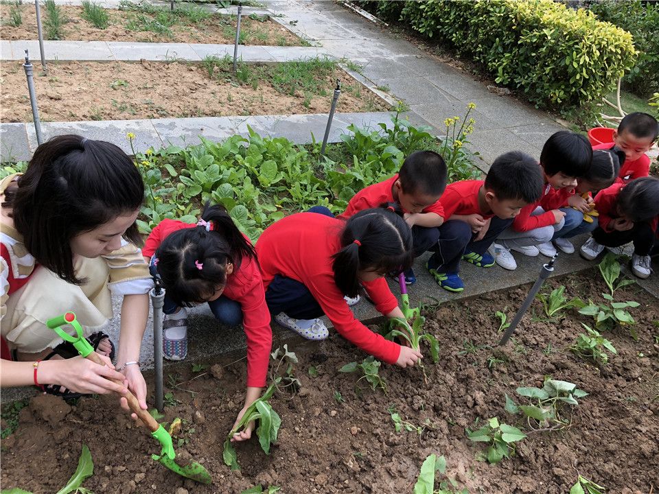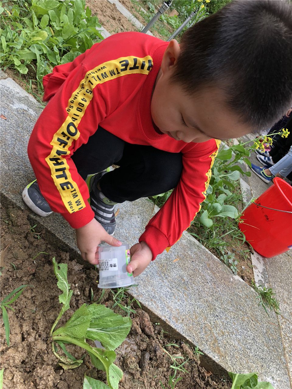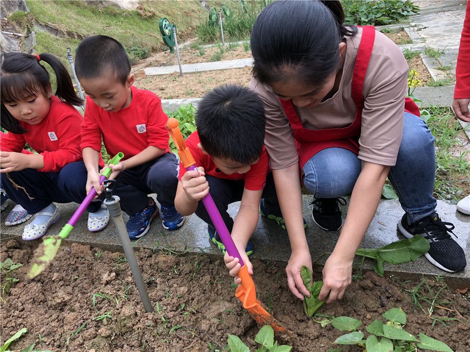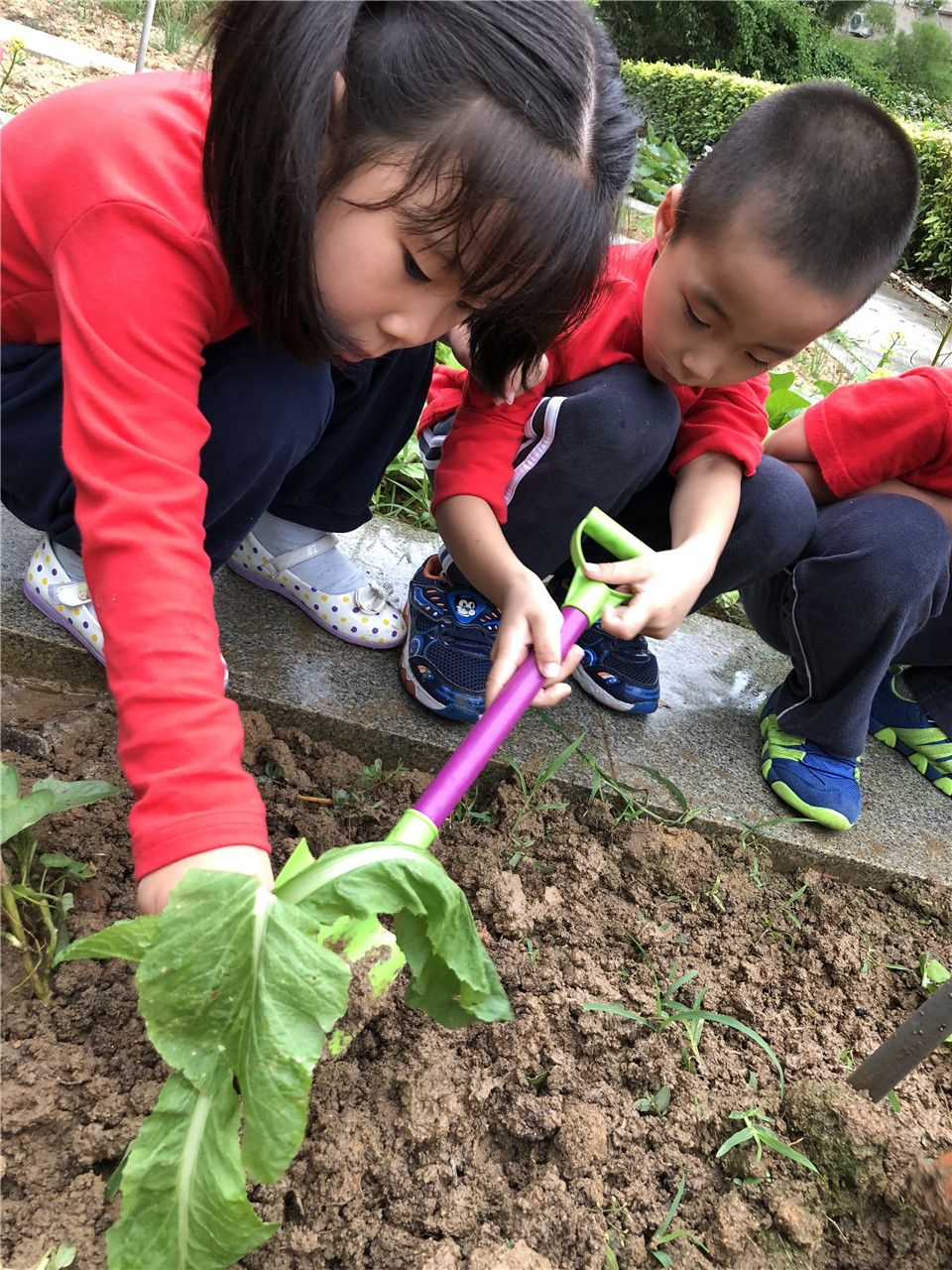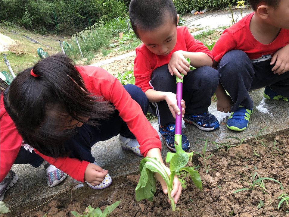 “老师,我知道怎么挖土”“老师,挖土完后我来一起平整菜地”“老师,我会种菜”,小朋友们积极性可高了,有的可以独立完成种下一棵菜苗,有的与小朋友合作,有的与老师合作,场面热火朝天。