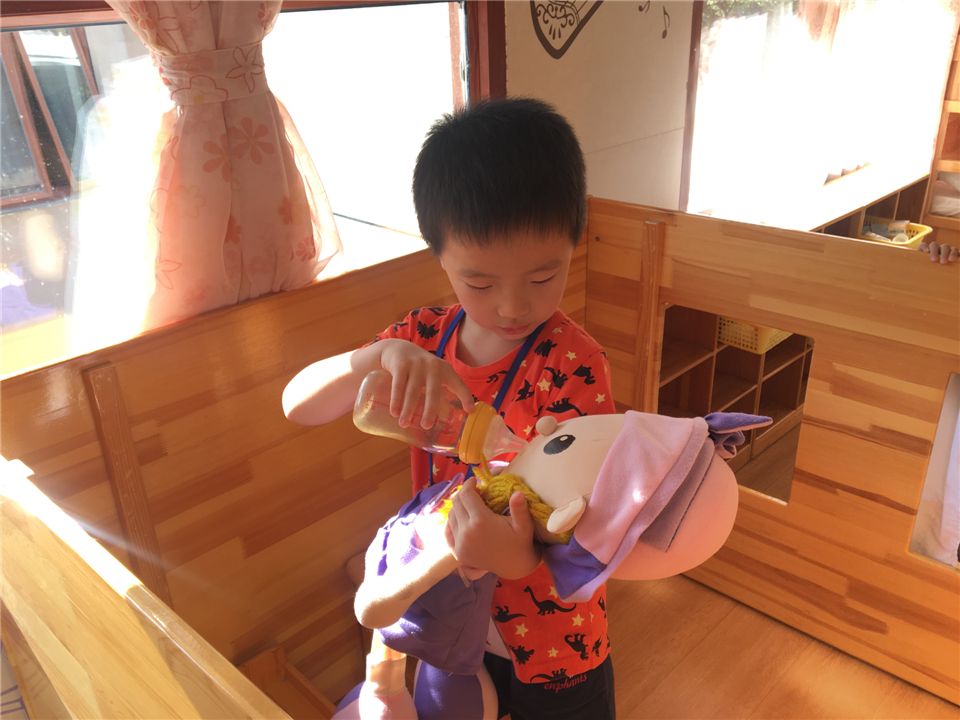 瞧,娃娃家里有爸爸妈妈,也有哥哥姐姐、爷爷奶奶。奕凡哥哥在给小宝宝喂奶呢。啊哦,有客人来了,钧越爸爸领着哥哥姐姐们在布置午餐,那菲姐姐在客人临走前打包了好多好吃的呢!嘻嘻,她们一家可真热情!