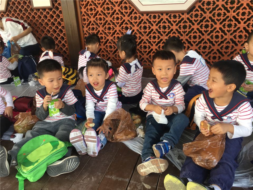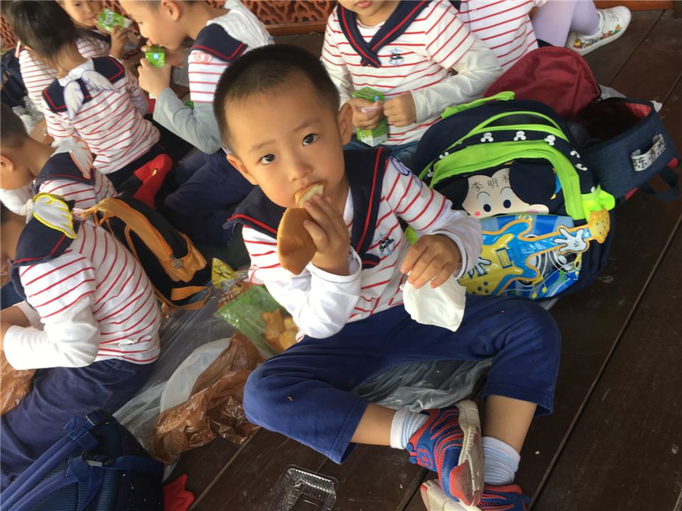 表演结束后,我们的点心时间到了,大家就着外面的美景享用起了幼儿园准备的小点心。真是太好吃了!