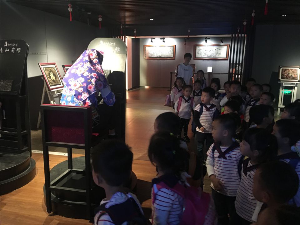 看!有个惠女姐姐正在刻雕画!我们都很感兴趣,目不转睛地研究着姐姐是怎么刻上去的,真是太神奇了!