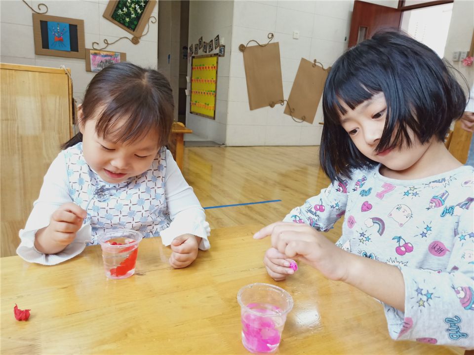 你看,将“面条”和“小汤圆”放到水里。咦?水立刻就变成红色、黄色、蓝色的了。哈哈,太开心了!来来来,一起干杯祝贺!