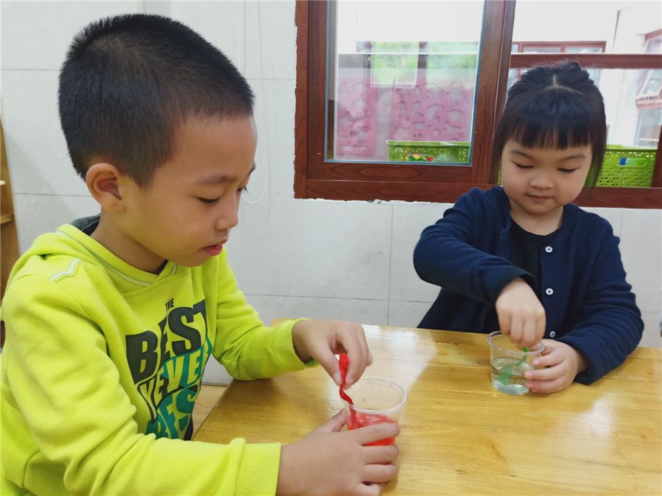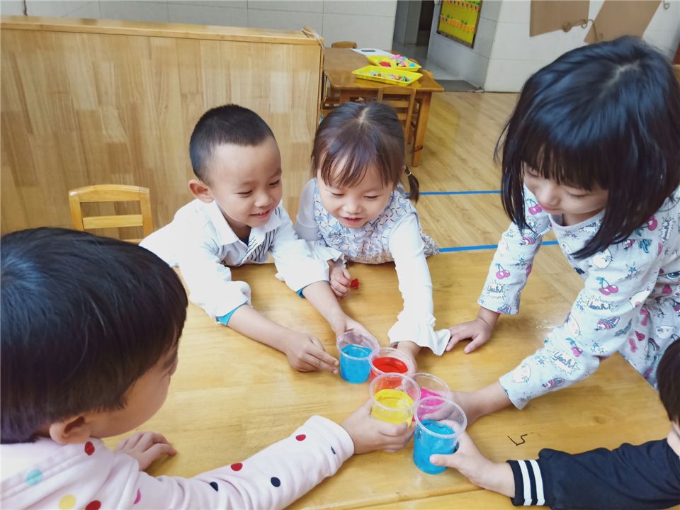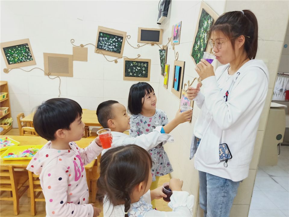 试一试,放两种颜色下去,会有什么新发现呢?哎呦,太神奇了,快看!红色、黄色变成“橙汁”。有的变成“可乐”,有的是“蓝莓汁”,有的是“葡萄汁”……老师老师,请你喝一杯!