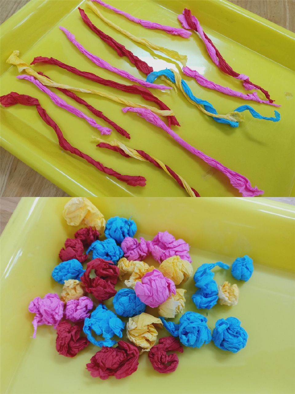 可可:皱纹纸很软,揉一揉,大大的纸张变成小纸球。