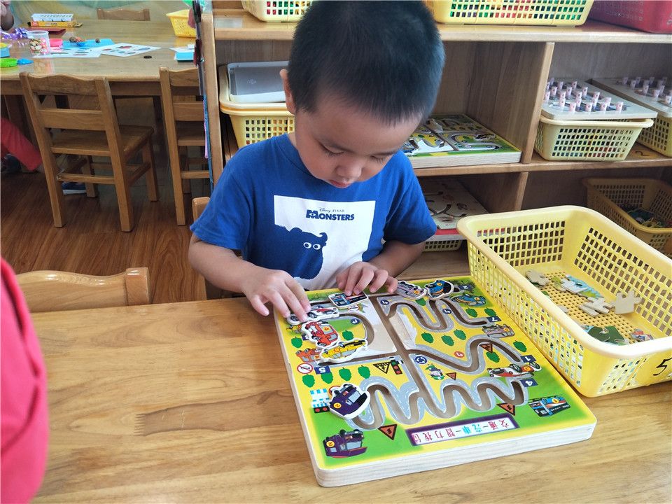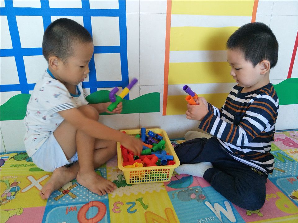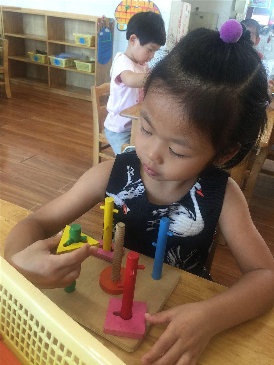 开心:“三个孔的积木能穿进两个突出的木桩上吗?。”