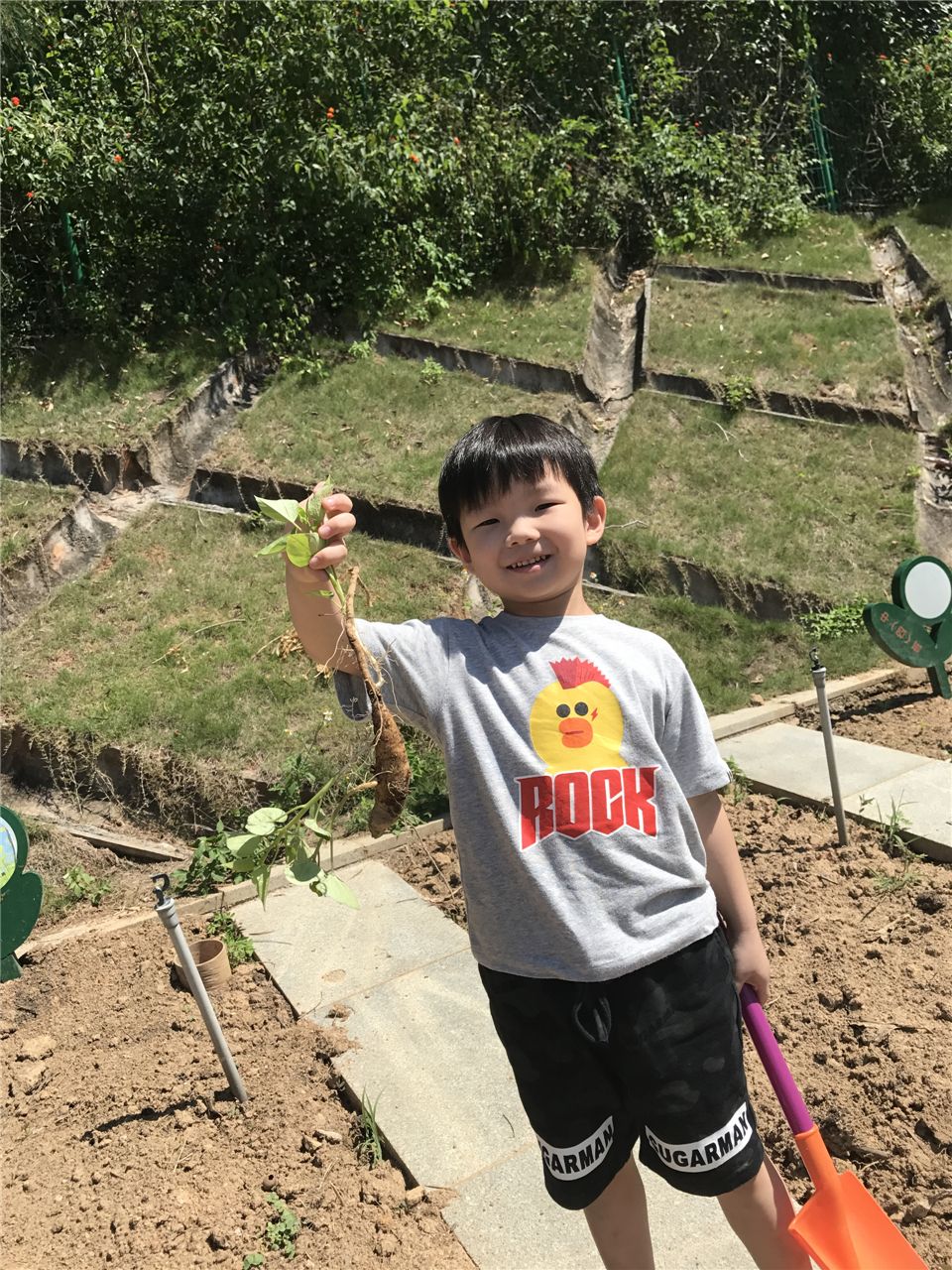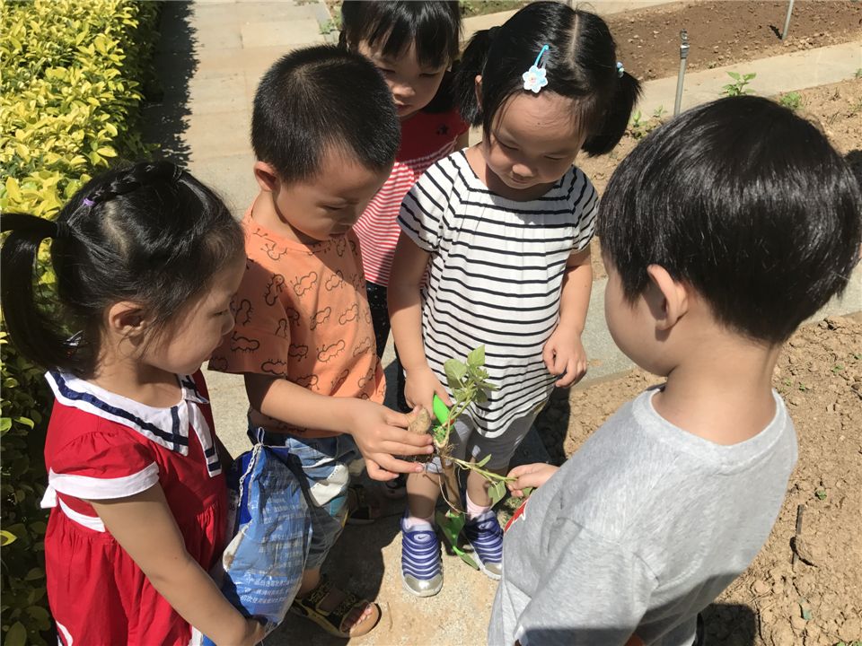哈哈,承承从地里拔出了一个新鲜玩意,几个小朋友凑过去正在研究这到底是地瓜还是胡萝卜呢?你们觉得呢?