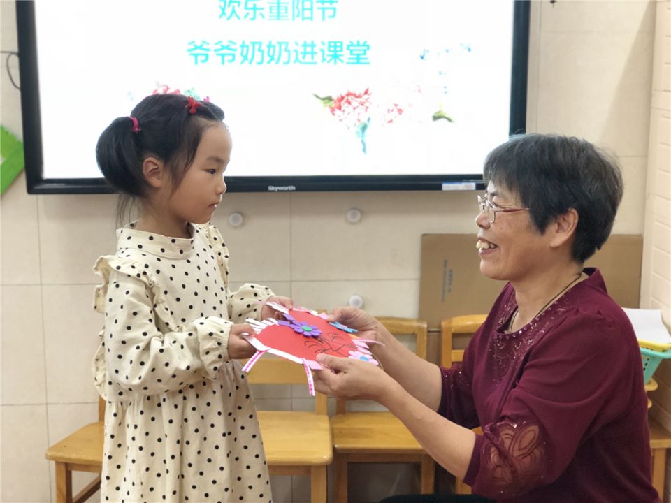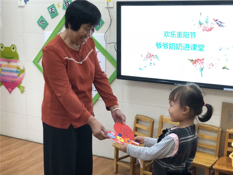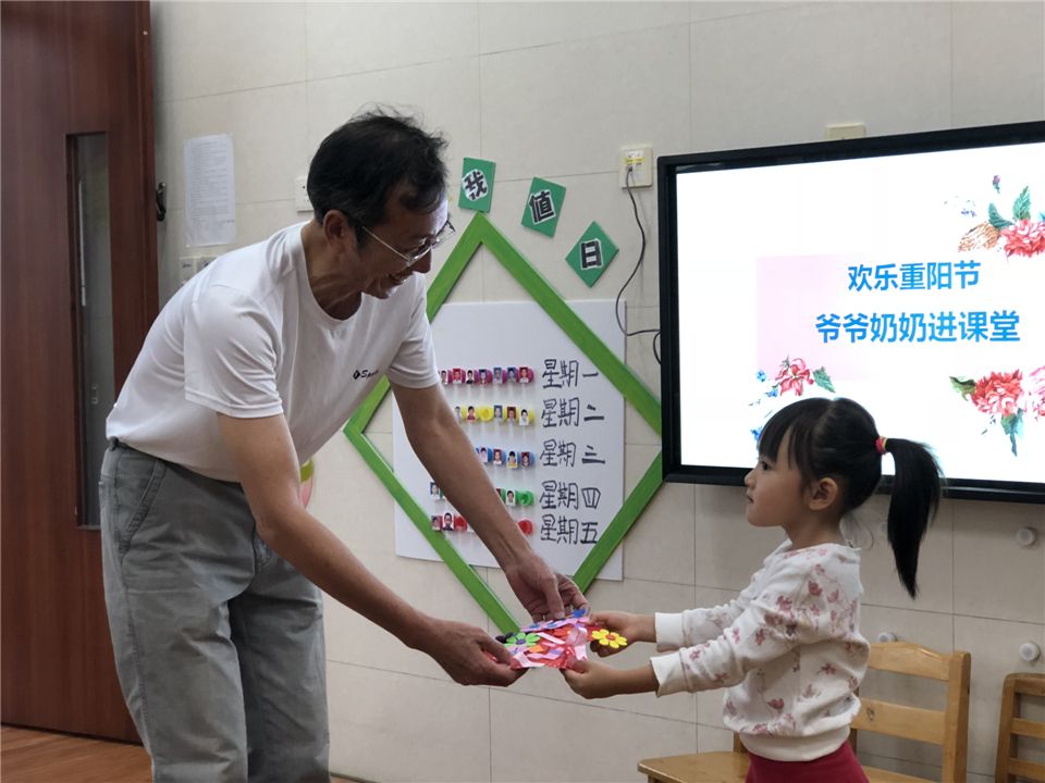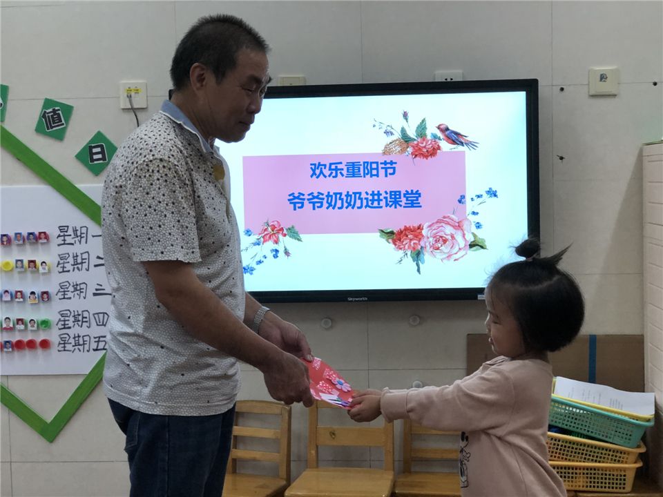 在这个美好的节日里,老师们邀请到了个别爷爷奶奶进入课堂,跟孩子们一起度过一个难忘的重阳节。