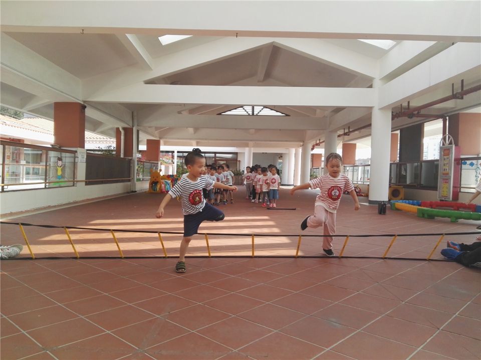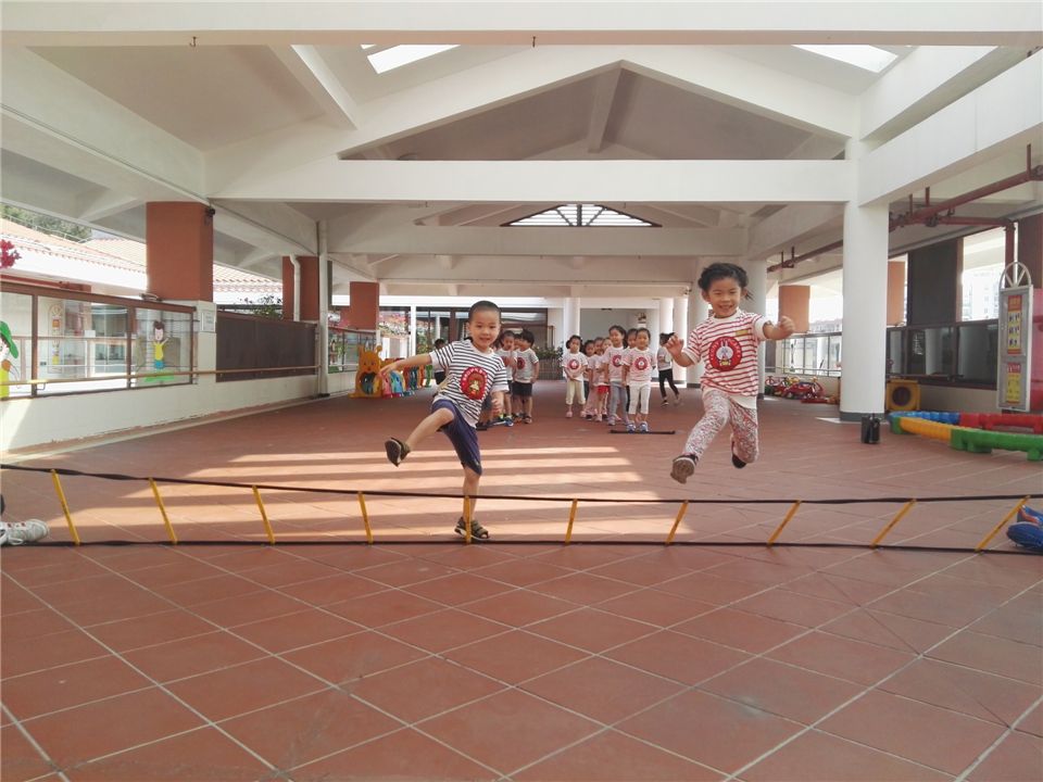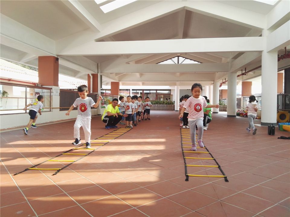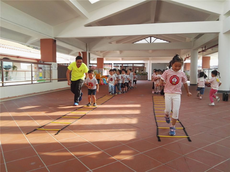 小手叉叉腰,小脚并并拢,要开始学小兔子跳了哦!瞧!有的小朋友动作不够标准哦,记住要双脚并拢跳跳跳哦!变花样了哦,现在我们要快速地跑步通过彩色梯的一格一格哦,记得要加快速度哈!