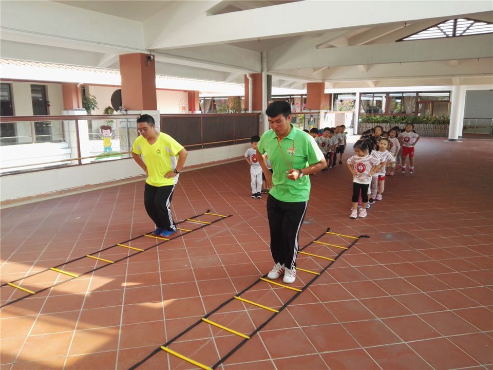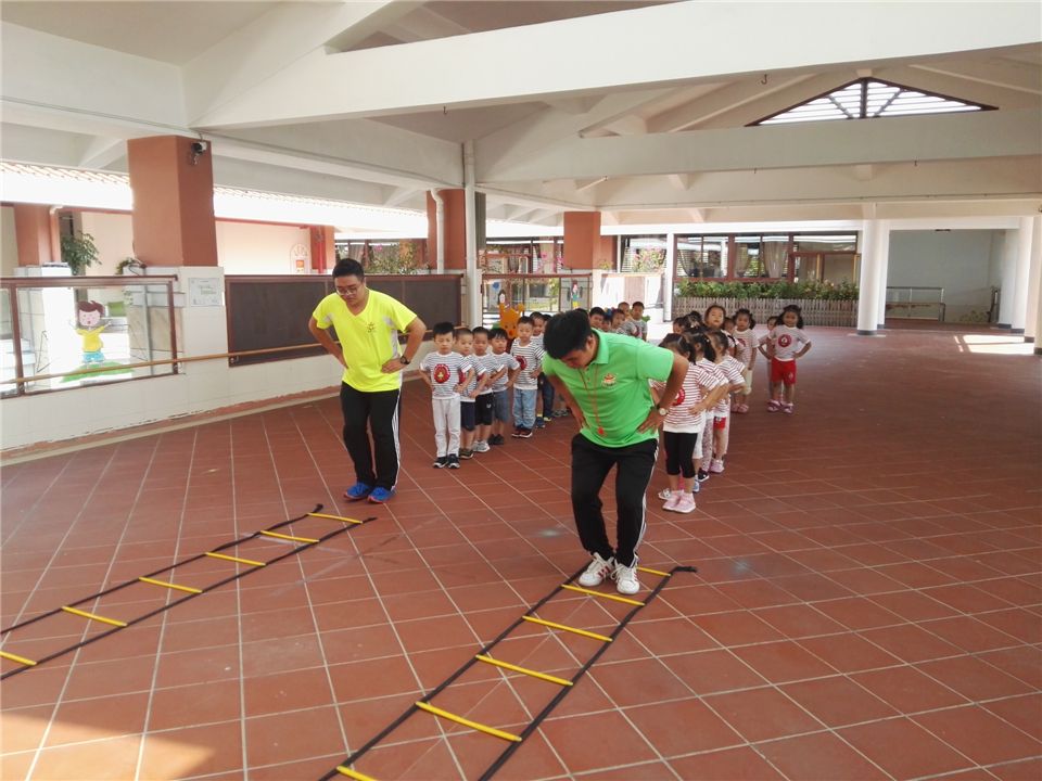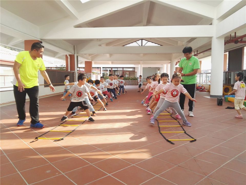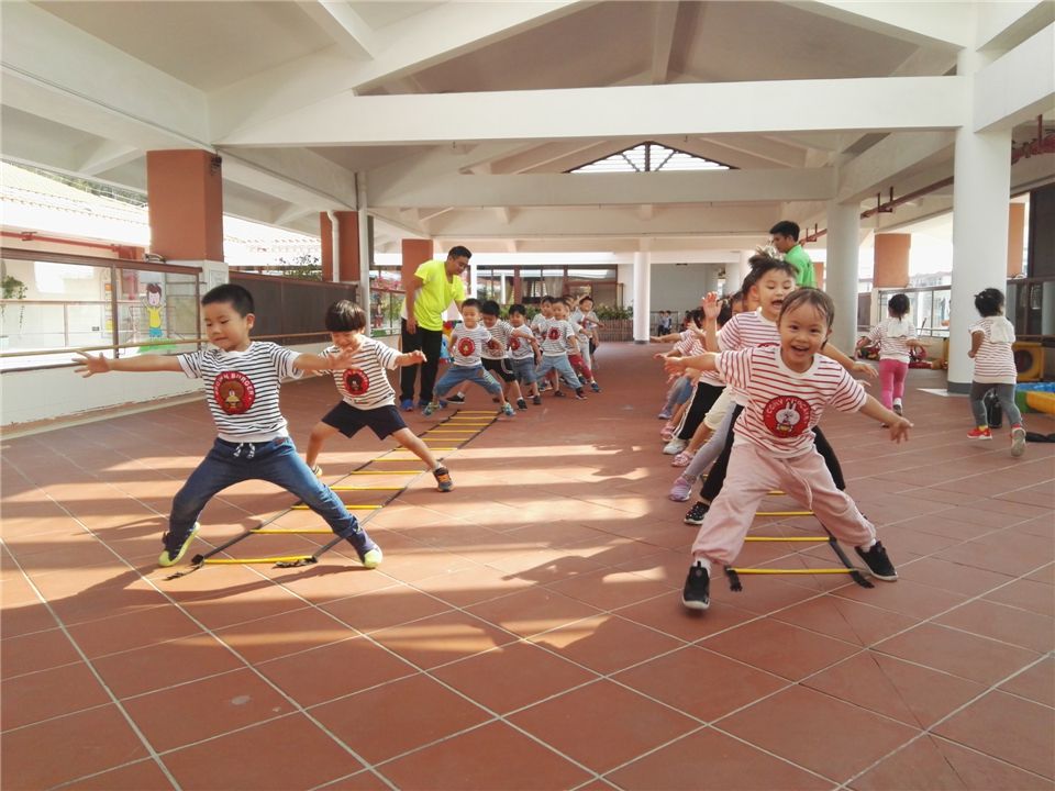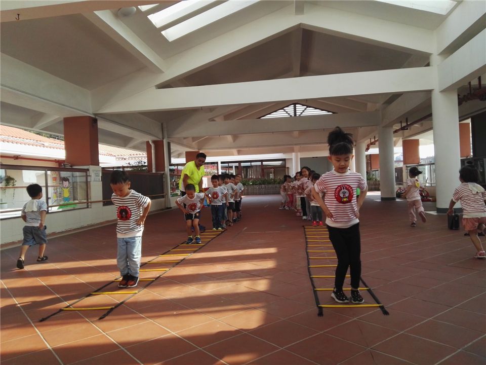 小手叉叉腰,小脚并并拢,要开始学小兔子跳了哦!瞧!有的小朋友动作不够标准哦,记住要双脚并拢跳跳跳哦!变花样了哦,现在我们要快速地跑步通过彩色梯的一格一格哦,记得要加快速度哈!