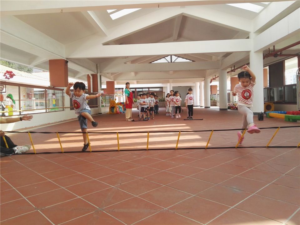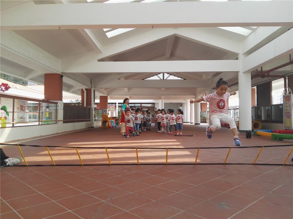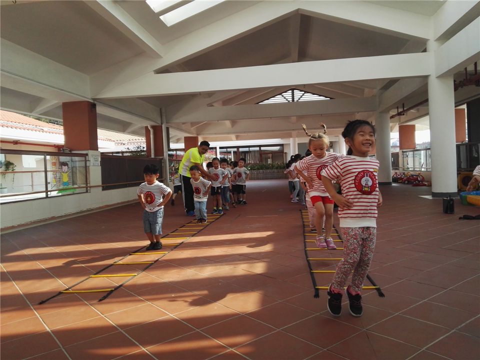 现在玩法要变化了哦!小朋友像在跳欢乐的舞蹈一样,随着活泼的音乐,在彩色梯子的两侧跨跳了起来,而且注意要将小手臂张开,保持平衡哦!