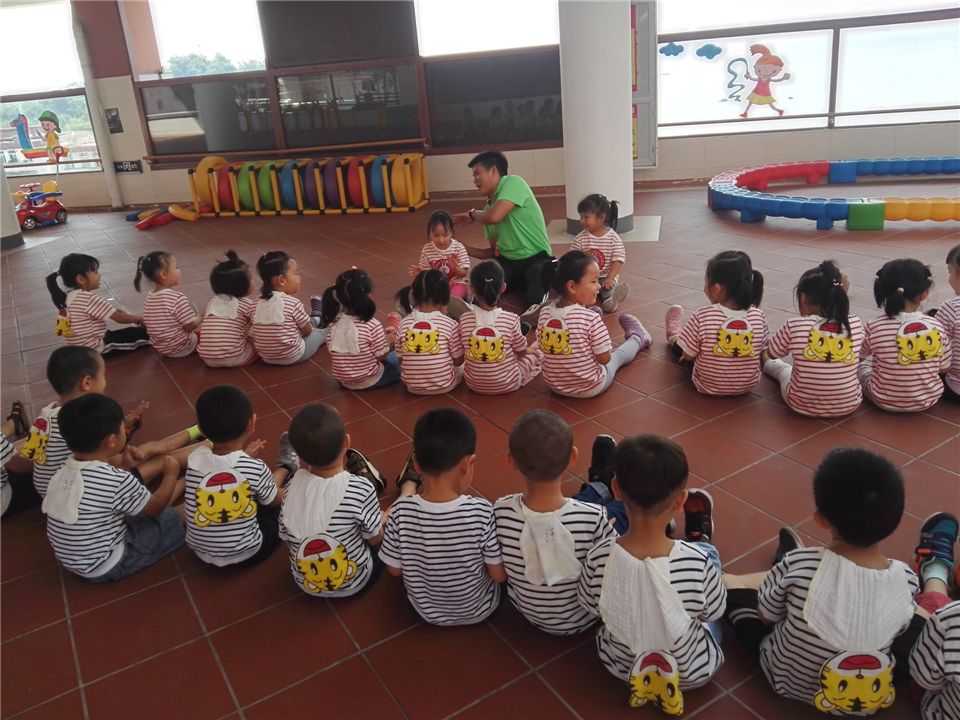 认真看哦,小虎哥哥在给大家示范运动玩法哦,萌娃们可认真了,眼睛眨也不眨的呢!