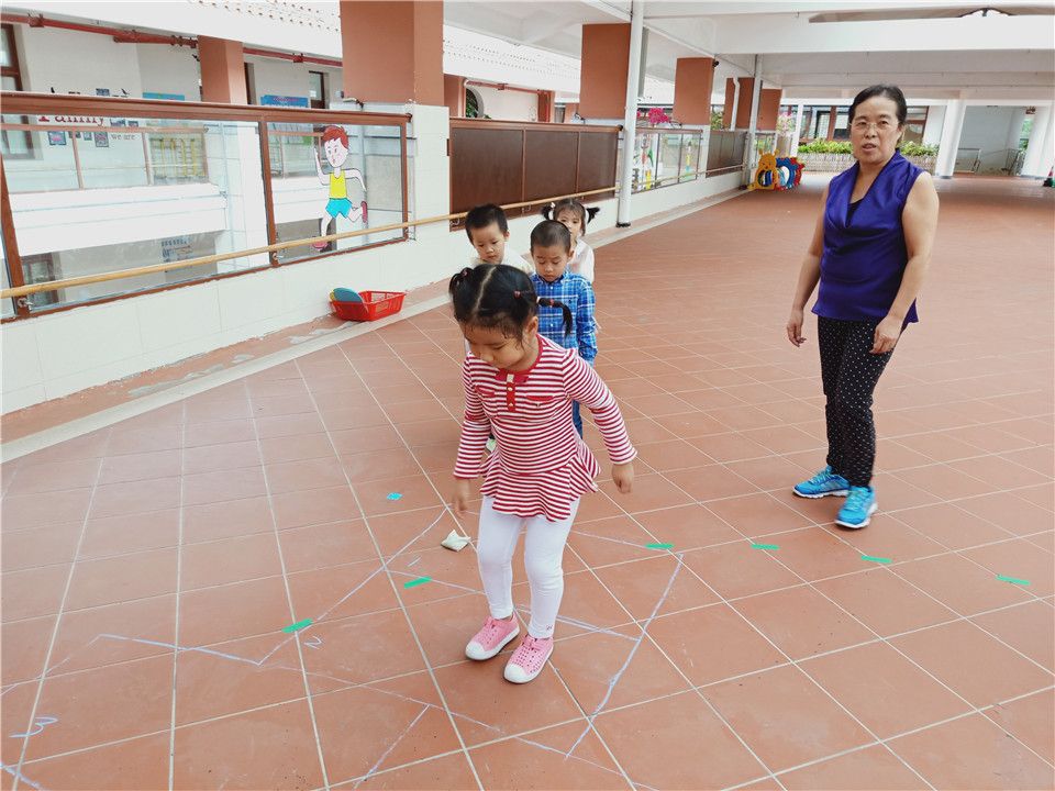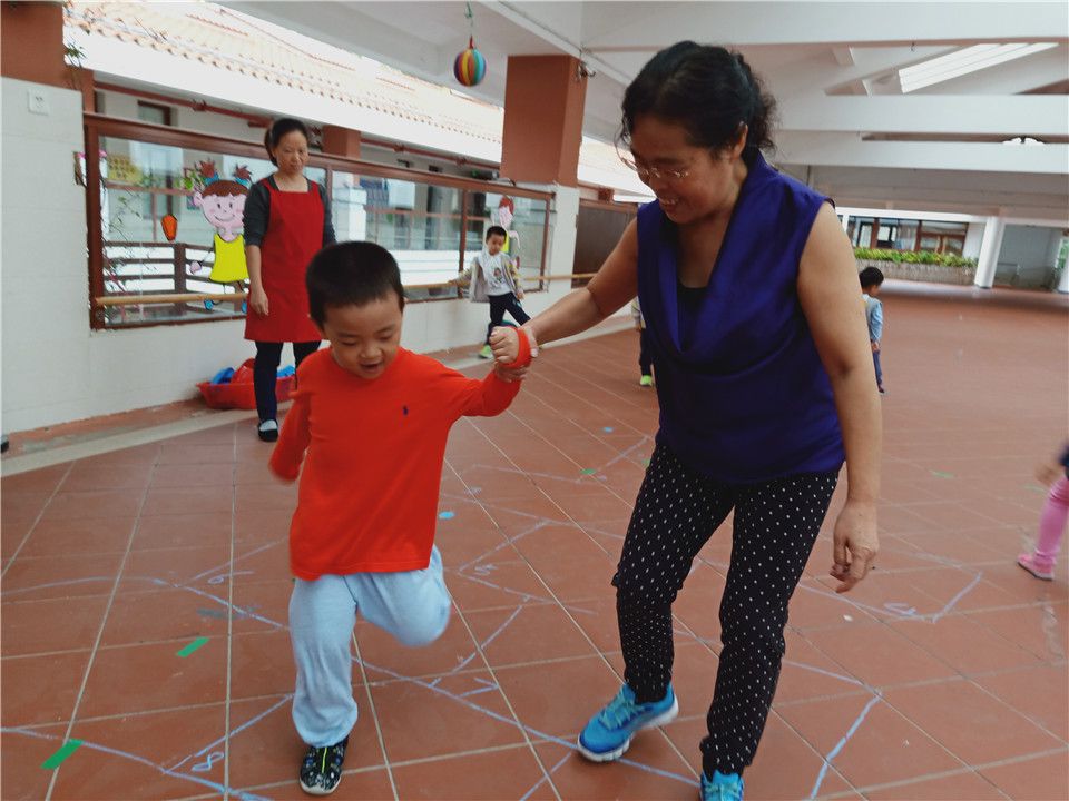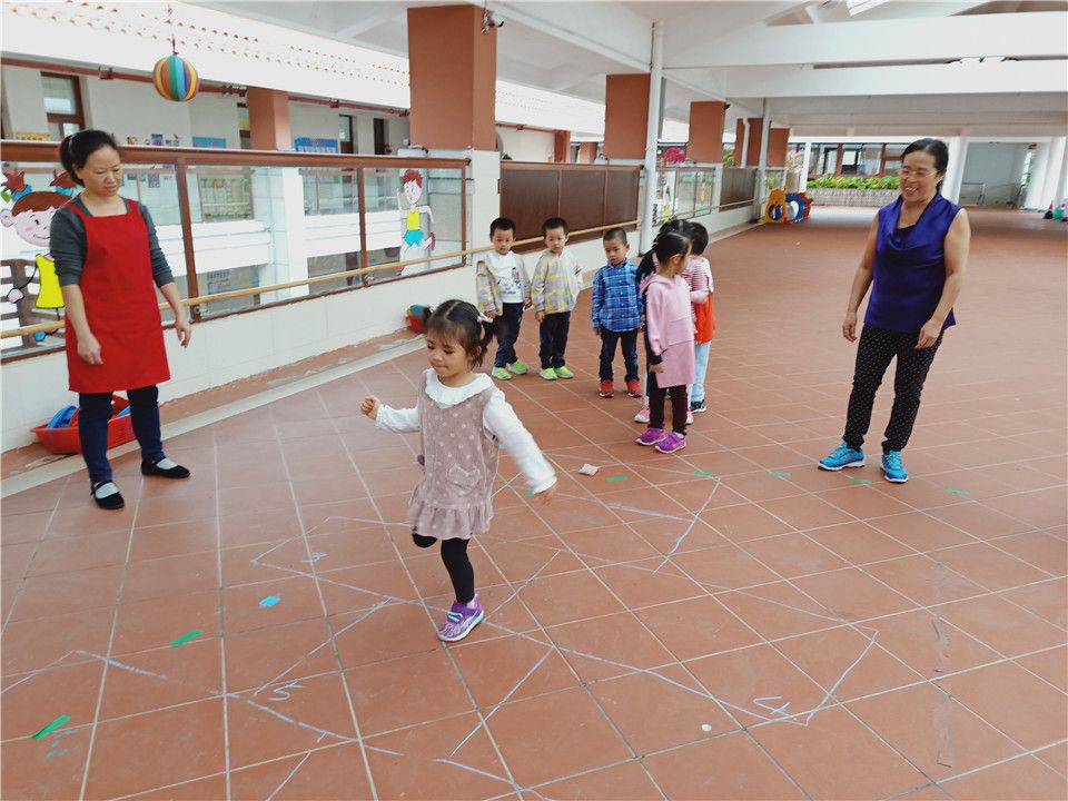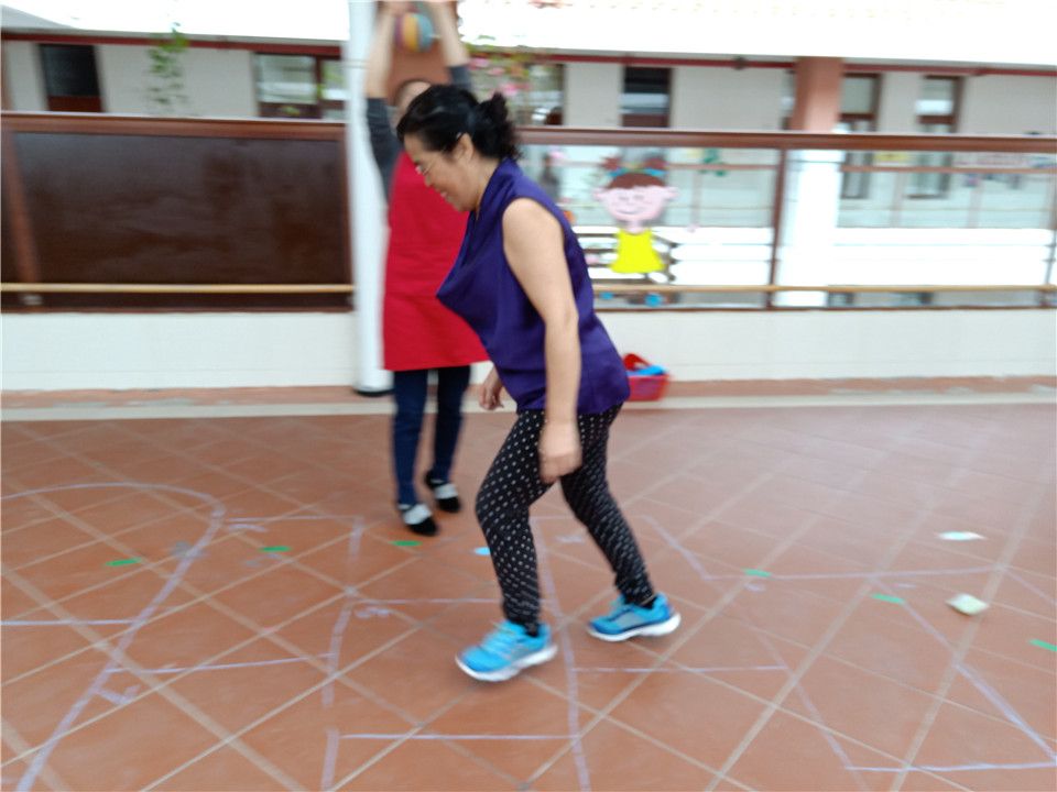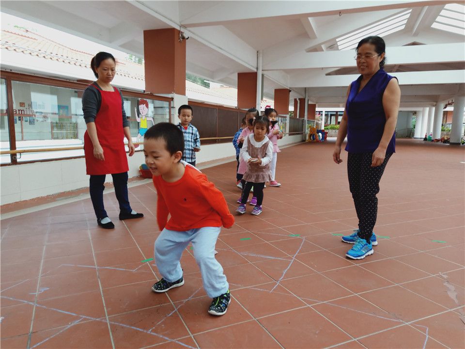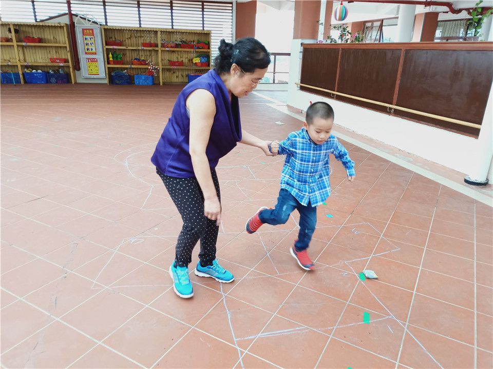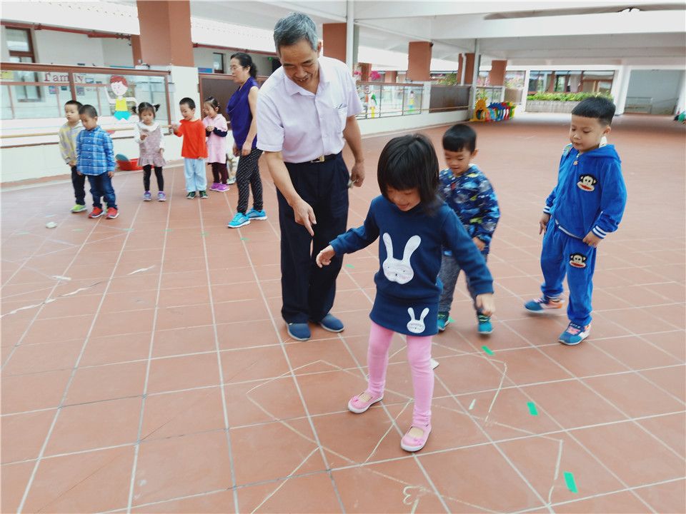 来,跟着爷爷奶奶一起,单脚跳,并脚跳,分合跳,耶!我们学会啦!