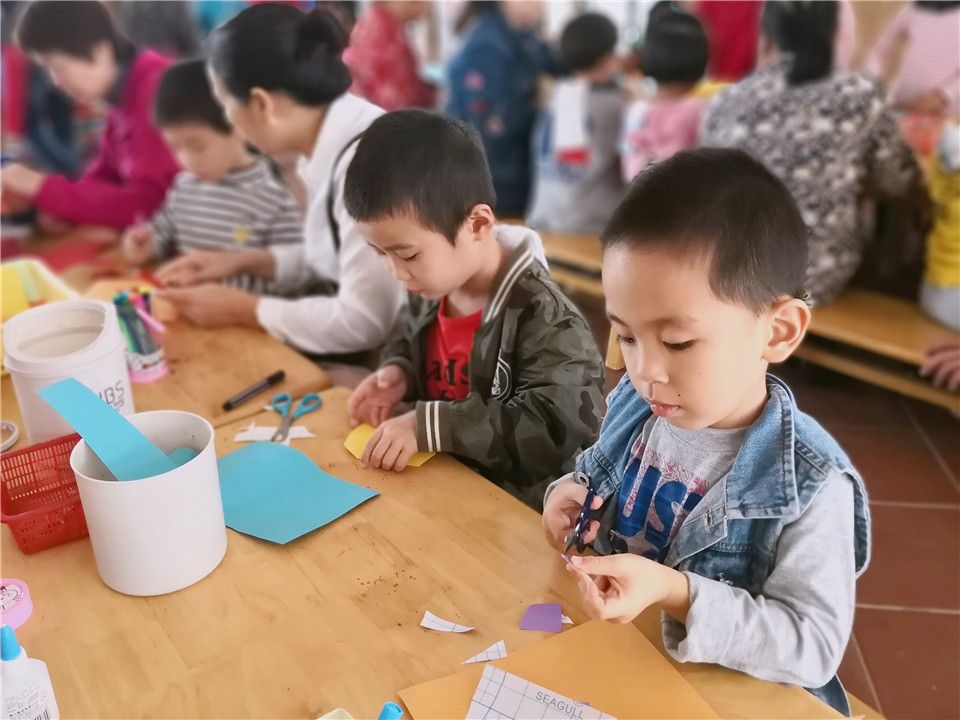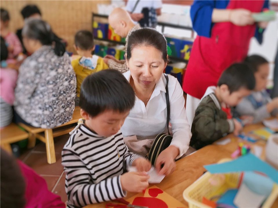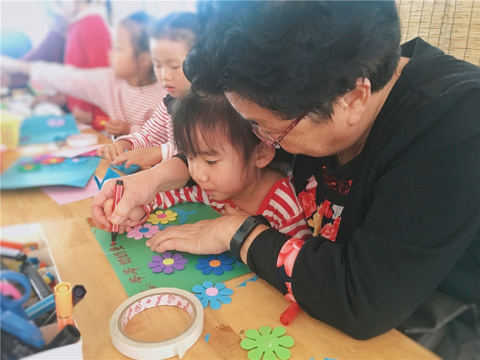 另外两组小朋友也不甘示弱:“小剪刀用起来,奶奶我为你剪个小爱心吧!”“奶奶,我折个小飞机,带你一块儿飞!”“嘻嘻,我的奶奶还带着我写下一段祝福的话呢!”