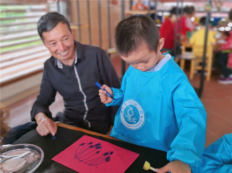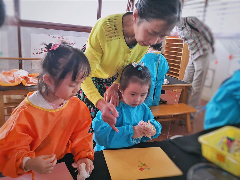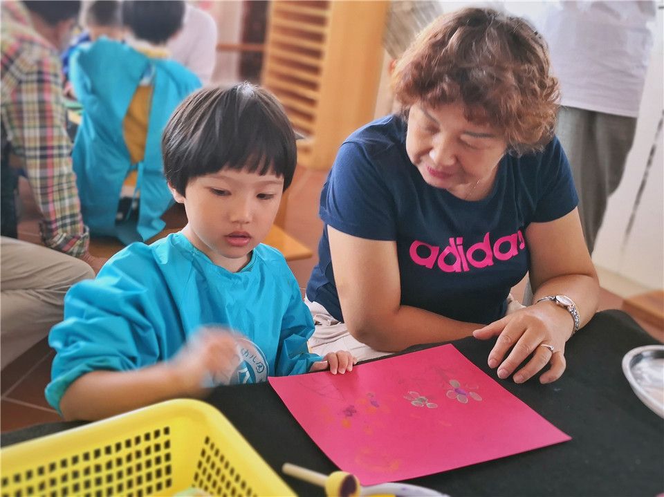 哦!原来有好多的爷爷奶奶在和小朋友一起做重阳节贺卡。看,我们的小手真厉害,能印出各种各样的图案装饰贺卡呢!还有我们!小纸张变变变,变出一朵小红花!