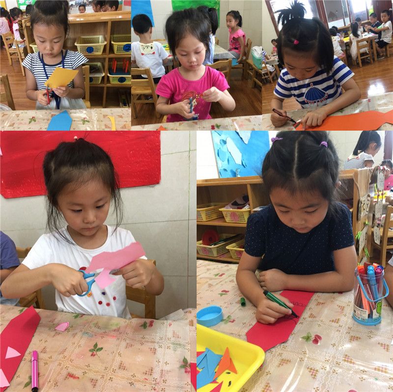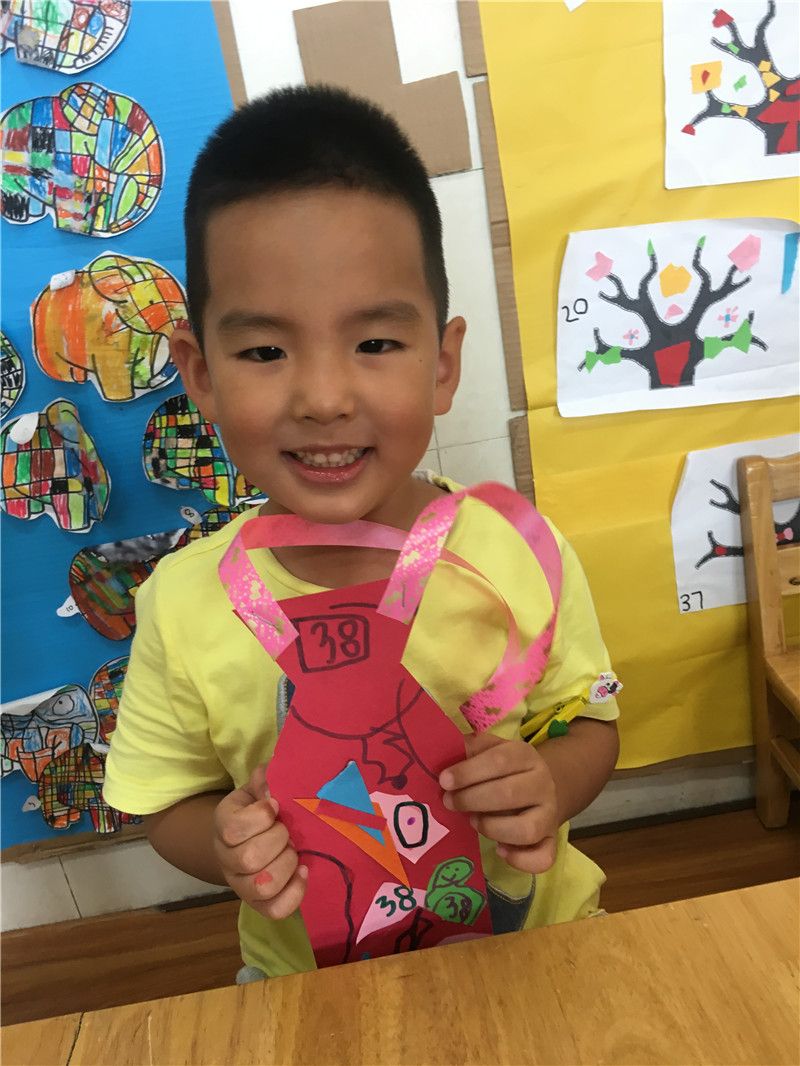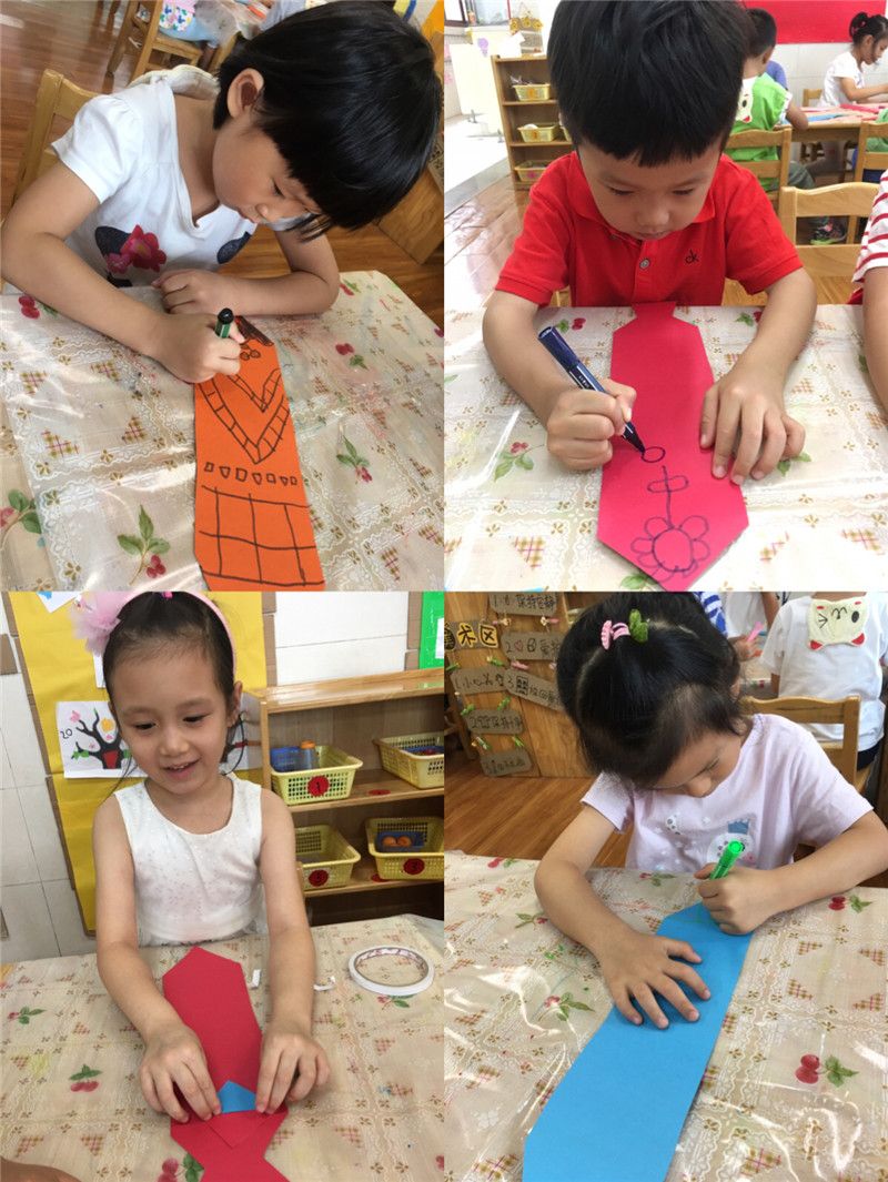 只见有的在领带上贴花、叶子、云朵,有的在领带上画格子涂颜色,“老师你看我给爸爸的领带画了一只小兔”、“我给爸爸领带画了一只老虎,我爸爸就是属老虎的”、“我给领带上贴五角星。”孩子们带着对爸爸的爱意寄情于领带之中……