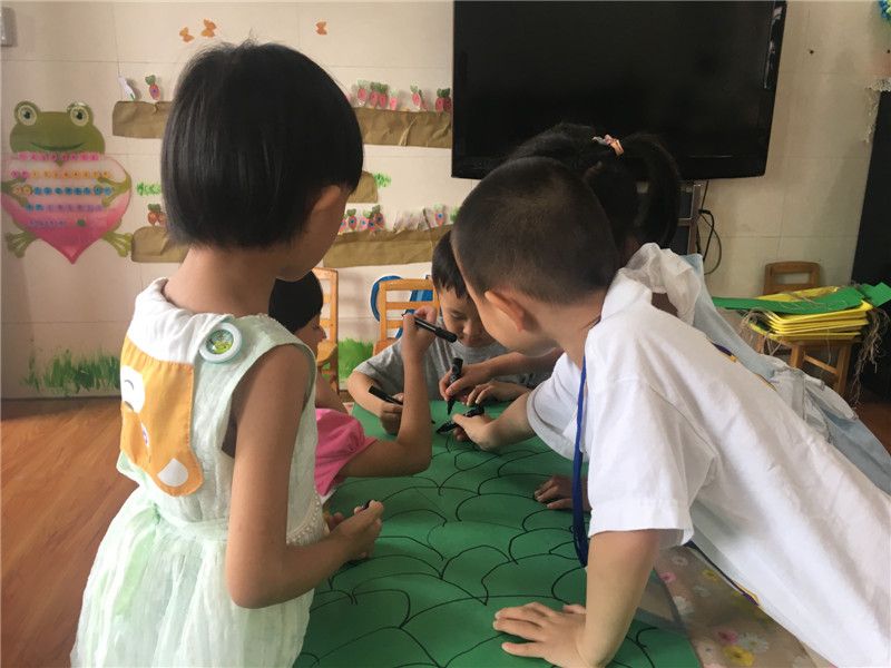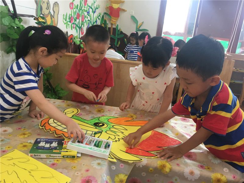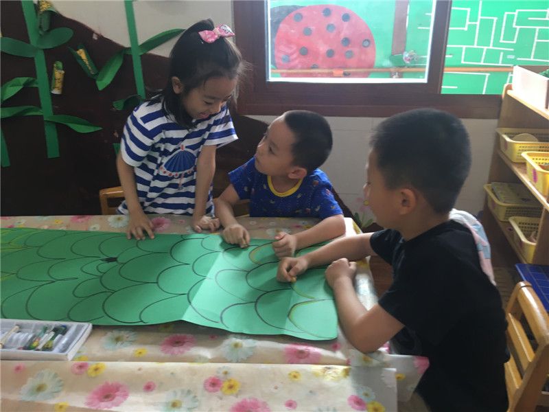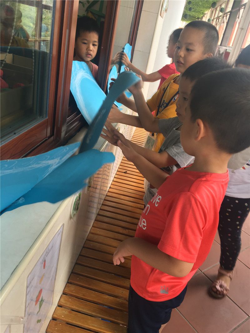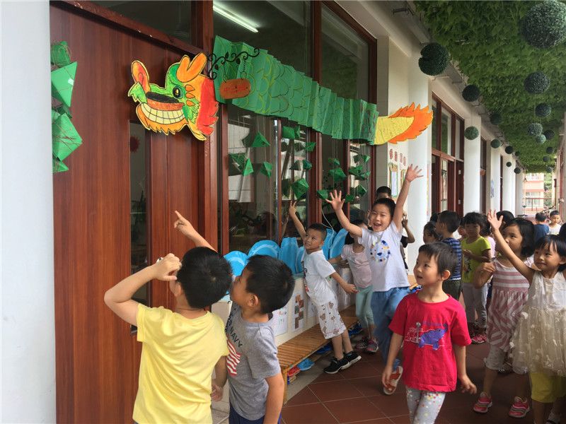 对于中三班的巧手达人们来说,过节不布置班级环创就是不过节。孩子们纷纷动手起来了:有的给龙头涂上颜色的,有的给龙身体画上花纹的,有的画浪花……一会儿功夫,一副大气的龙舟版面就出现在中三班的玻璃墙面上。