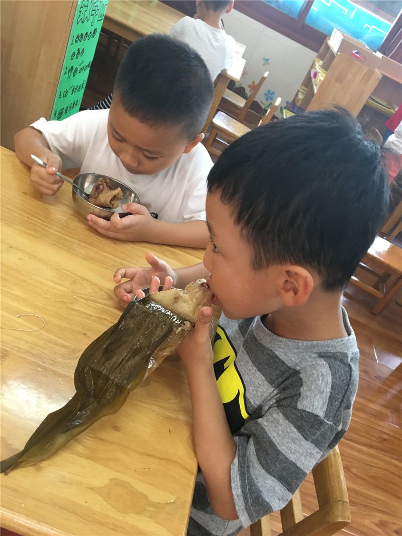 为了孩子们能够更好地体验到中国传统节日的习俗,节日前幼儿园和食堂的叔叔阿姨们给孩子们准备的点心就是甜粽子。对于小吃货们来说,看到美食的那一刻双眼是放大的,口水都要流出来了啦!心急的吃货们,一拆开叶子就开始大口地咬起来边称赞:“真甜呀!真好吃!”