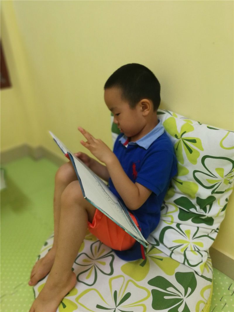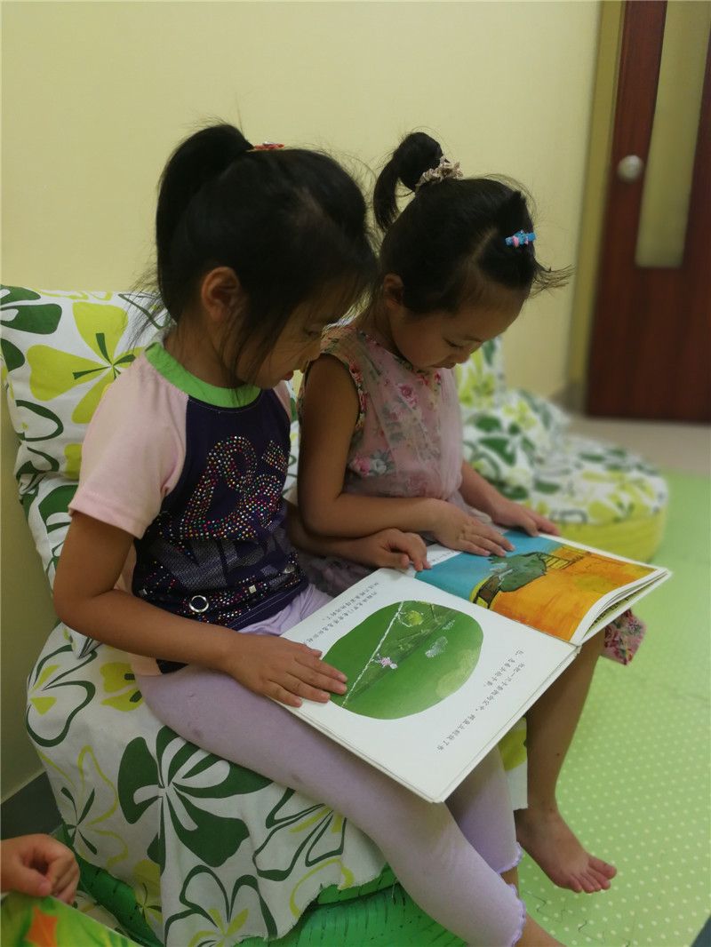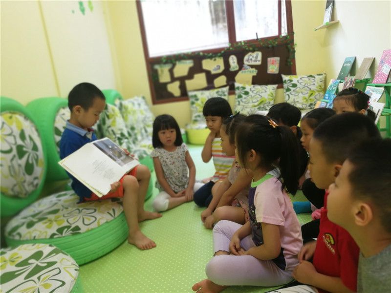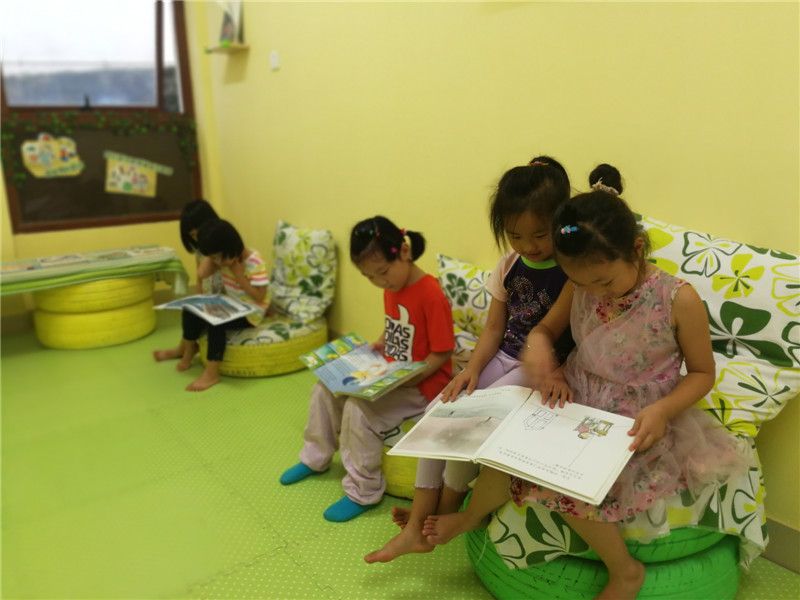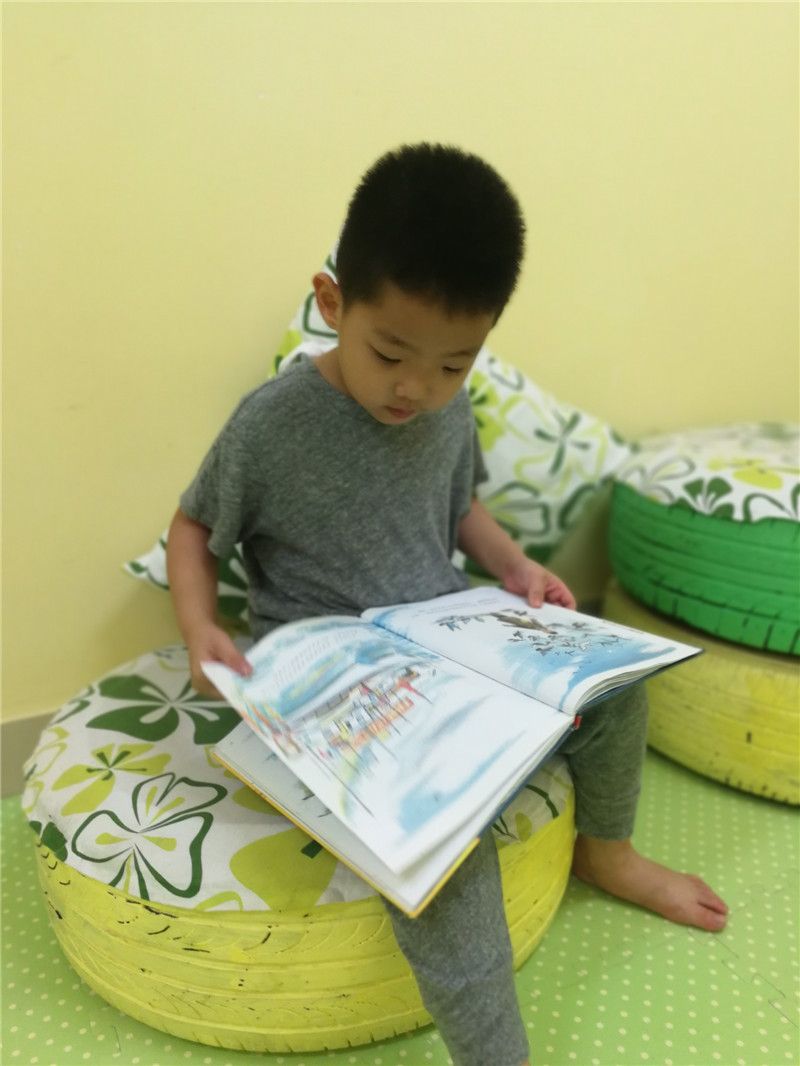 瞧,一个个稚嫩而又认真的小脸庞出现在了这个安静的地方,他们手里捧着书本,仔细又耐心地翻看着每一页精彩而又有趣的画面,还时不时和身边地小伙伴交流着,讲述着……在这里没有孩子拿到书本后,随便翻了翻,就丢到一旁,因为这里有太多有趣的绘本供他们选择了。