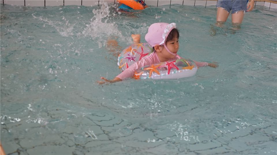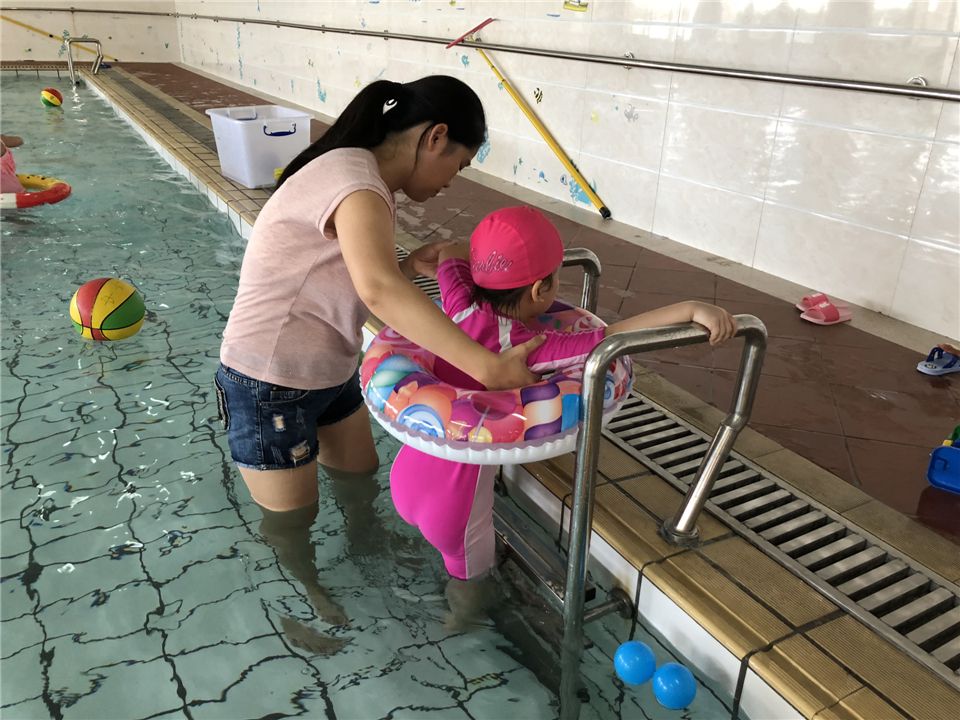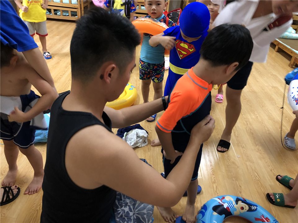 老师和爸爸妈妈们给大家讲了很多玩水的注意事项。激动人心的时刻到来啦,终于可以下水咯!老师和爸爸妈妈们小心翼翼地扶送大家下水!