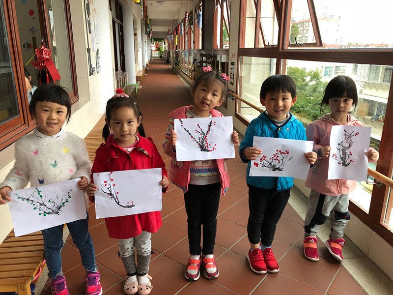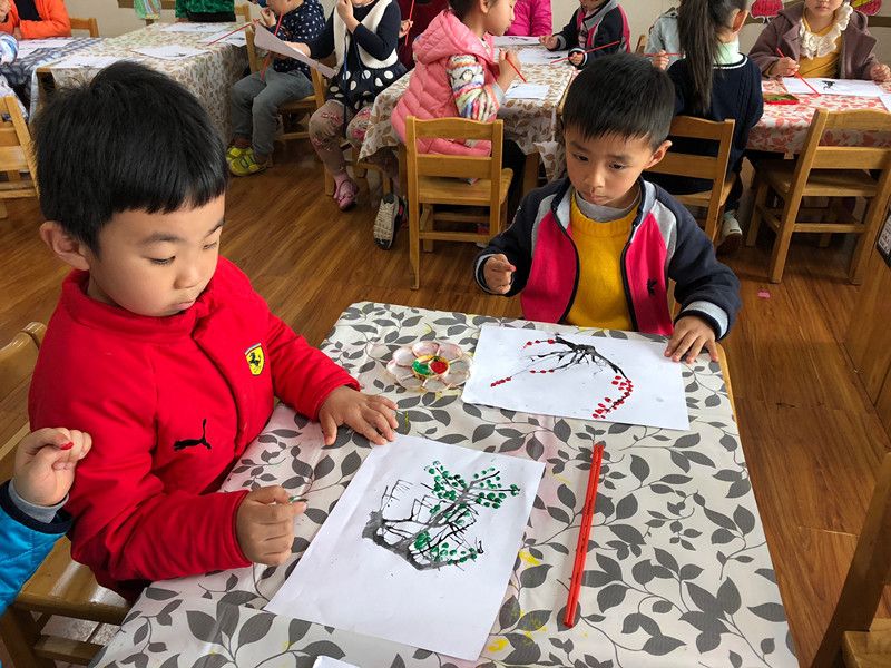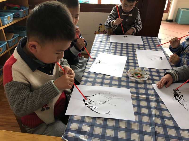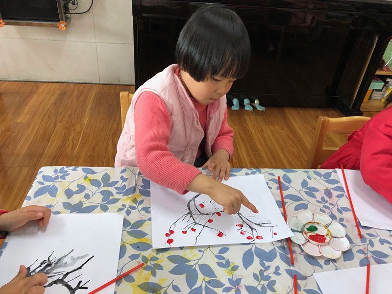 如果想更有意境,在树枝上点上或红或黄的几点颜料,一颗颗美丽的梅树或桃树就映然出现在画纸上……