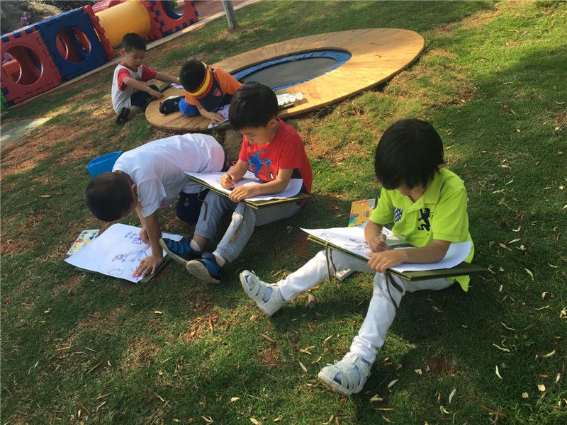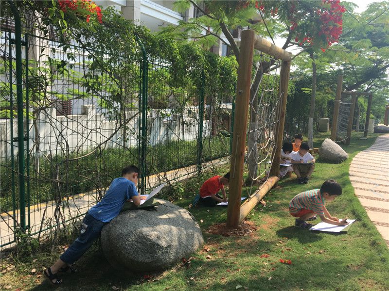 在和老师讨论完如何在写生时画出最美凤凰花后,萌娃们就迫不及待去寻找最绝佳的写生位置。元元和乐乐忍不住说:“老师,我们能到那棵凤凰花开树下画”“当然可以了,去吧!”得到允许后,又多了几个“志同道合”的小伙伴,有的坐在大石头上,有的直接坐在树下,有的则坐在木桩上……姿态万千。山坡上的树荫下,几个女生已是下笔如有神,凤凰木花开的姿态已跃然纸上。边上的蓓蓓则整个趴在绿草如茵的山坡上挥笔写生着,随着阵阵凉爽的海风吹过了脸颊时不禁感慨:“这真是最舒服的画画呀!”,而当当和彤彤等几个萌娃则把位置选择在山凹上。看,他们排排坐在山坡上,腿上摆放着画板,明亮的双眸眺望着前方的戴着花冠般的凤凰木,稚嫩的小手不时勾勒出凤凰木树干的姿态,颇有专业写生画家的架势。