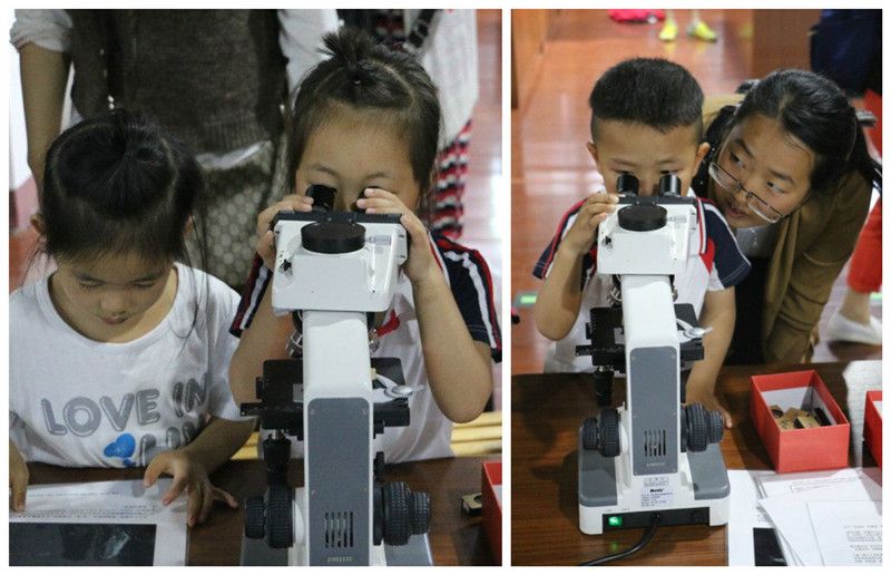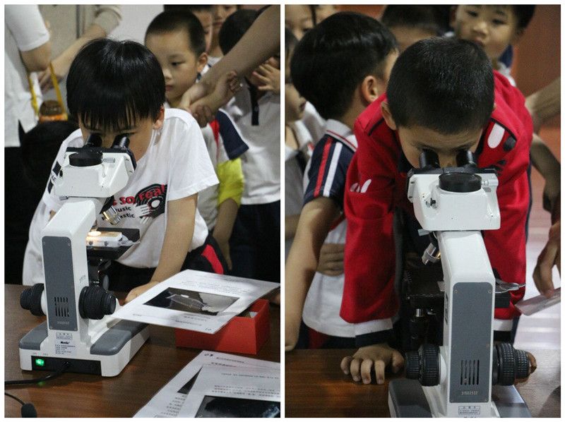 除了了解知识,还有有趣的实践操作呢。贴心的志愿者哥哥为孩子们准备了显微镜和洋葱标本,让孩子们感受放大后另一个世界。