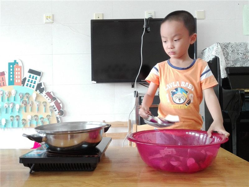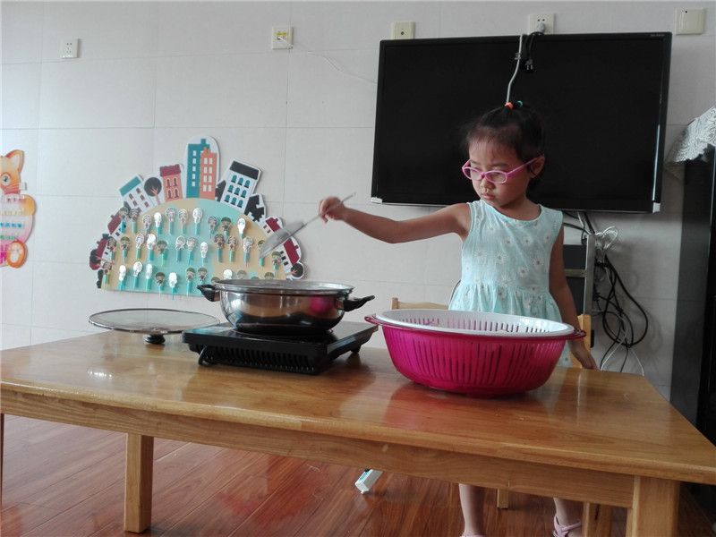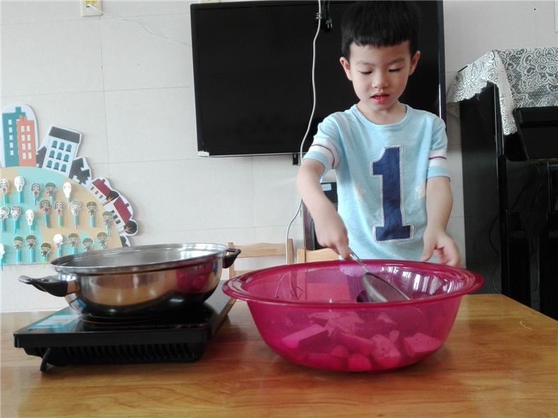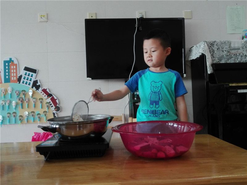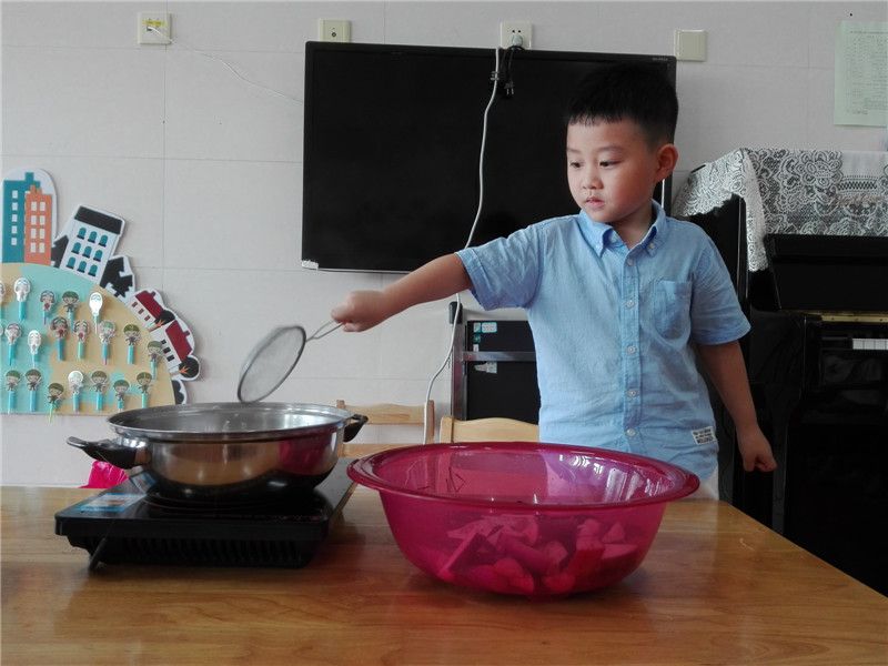孩子们亲手将茄子放入锅中,不一会儿茄子的香味就慢慢飘出。