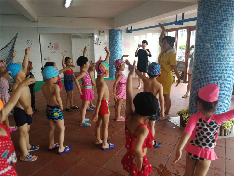 这不,今天又是中四班的小朋友们日思夜想的戏水课啦。一大早,小朋友便带着他们的“装备”,一路又蹦又跳,和小伙伴们有说有笑地来上学……在清澈见底的游泳池边上,安全员爸爸带领着小朋友们做了热身运动。孩子们“1、2、1、2……”地跟着喊节拍,热身运动结束后,他们迫不及待地想跳进水里,像一条快乐的小鱼,自由自在地在水里游来游去。