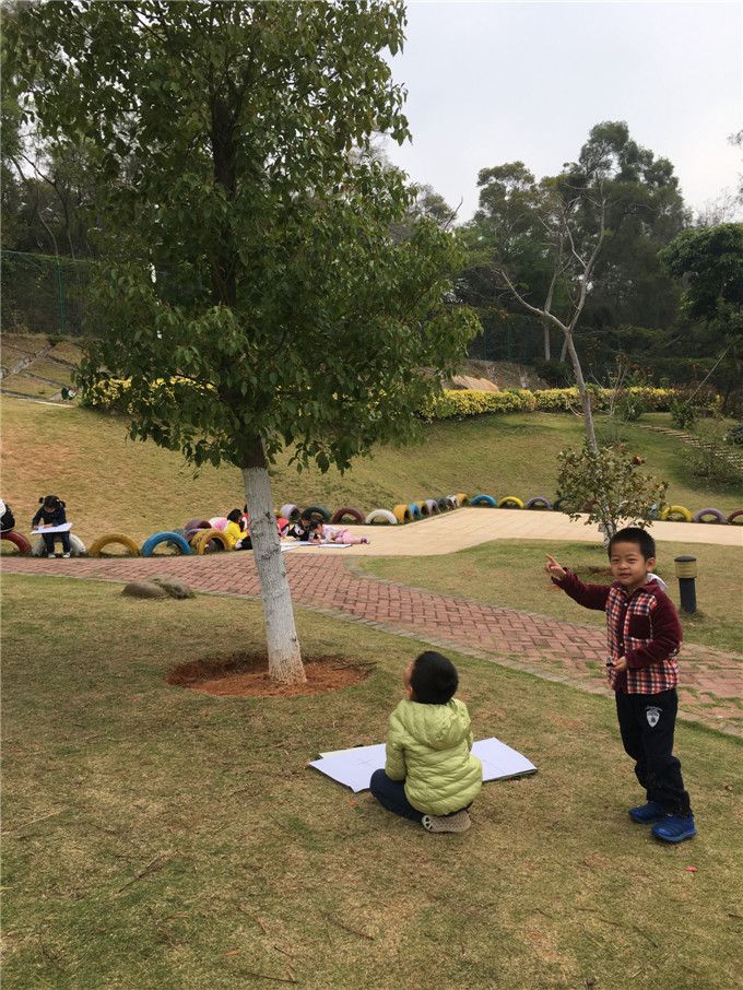 迈着轻盈的步伐,乘着明媚和煦的阳光,孩子们兴高采烈地来到目的地——幼儿园小山坡。一边听老师的讲解一边欣赏山坡上各种花草、树木的姿态。一找到自己心仪的位置,孩子们就迫不及待地拿起画笔像模像样地描绘起来。