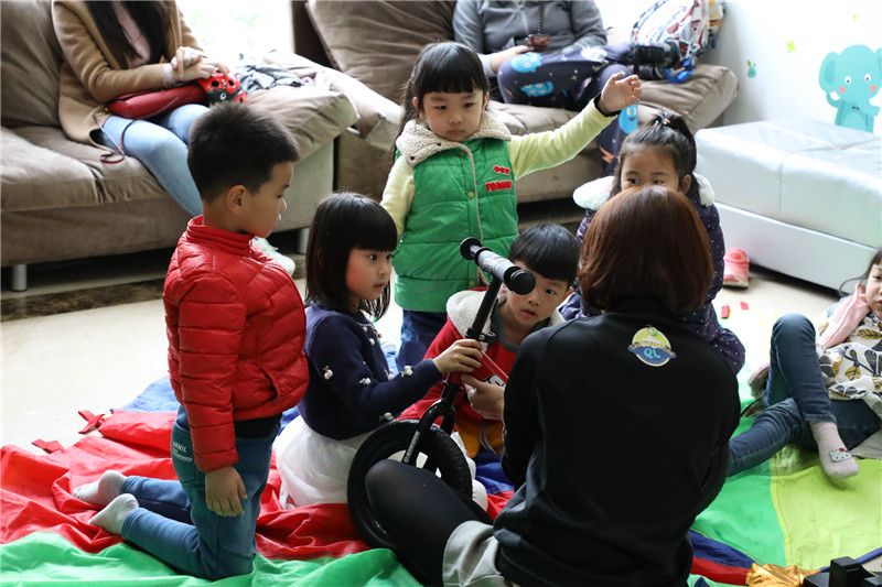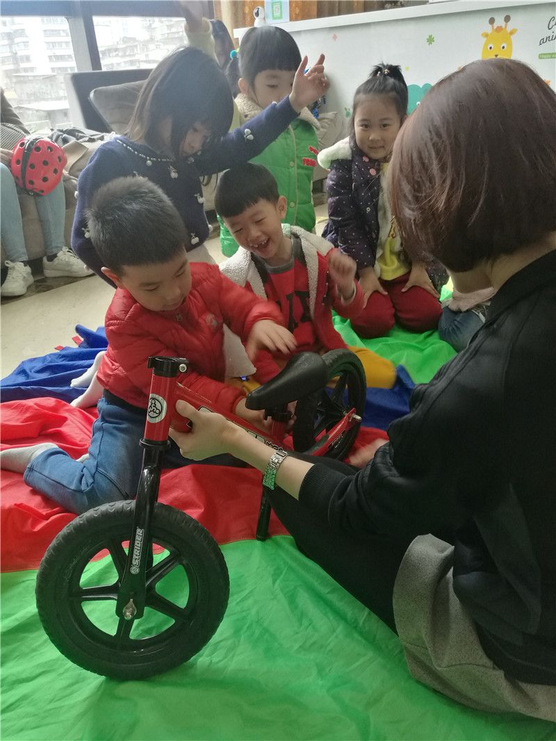 绘本《好玩的自行车》拉开了活动序幕。绘本中主人公马丁收到了一份生日礼物——红色的平衡车,帅气的平衡车成了马丁最好的伙伴……老师抑扬顿挫的语调、夸张的动作,小朋友们专注的表情,让爸爸妈妈们都自觉地保持安静,小朋友们不时与老师讨论绘本里的情节,并提出一些古灵精怪的问题,兴趣盎然。