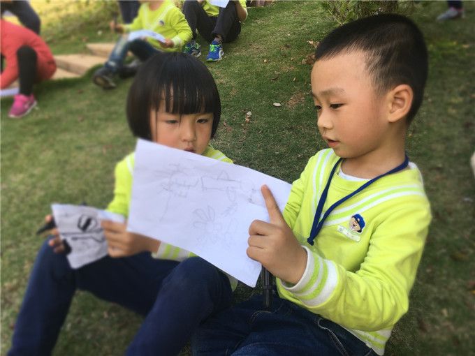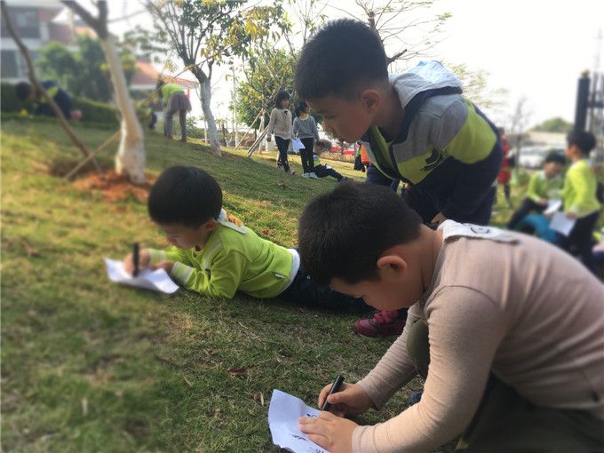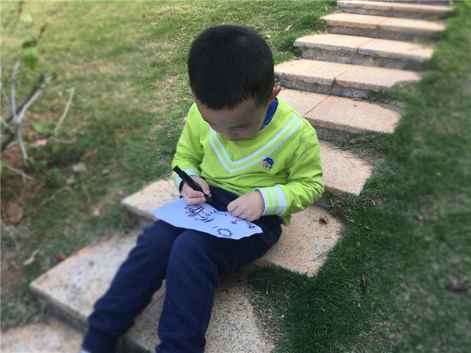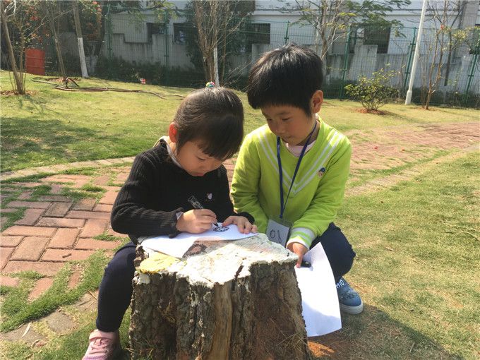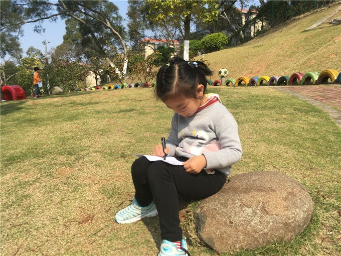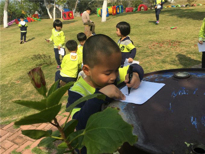 小朋友们来到小山坡,穿梭在小山坡的各个角落,时不时地停下来记录着、讨论着,趴在草地上的,坐在石头上 ,倚着油桶旁的,蹲在树桩边的,台阶上的,山坡上任何东西都成为了他们记录的好地方。