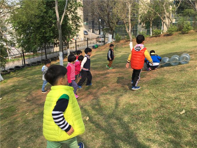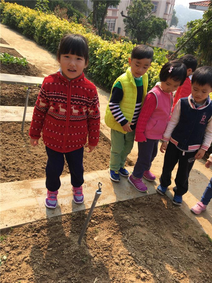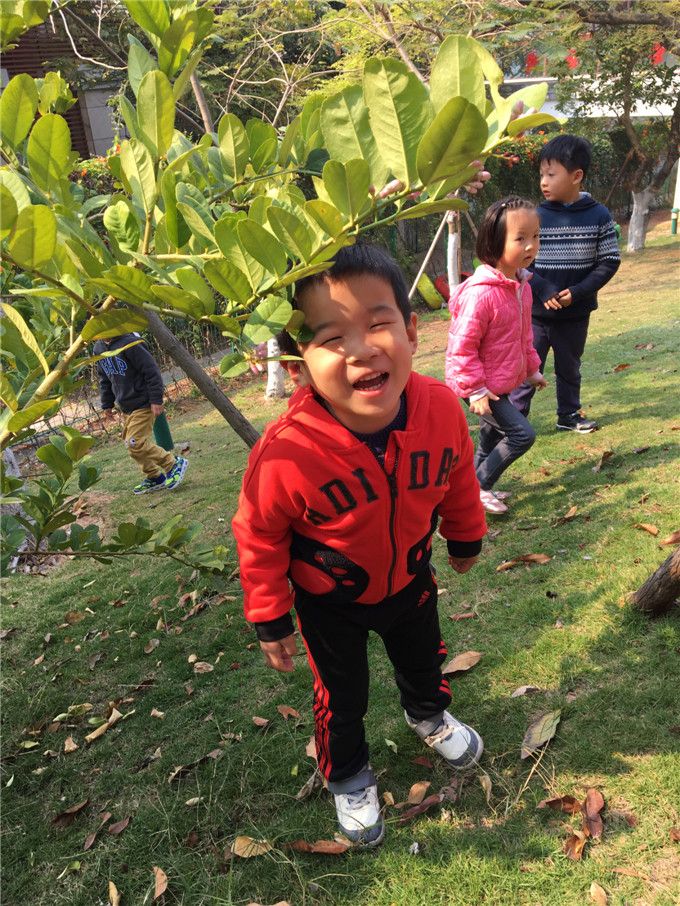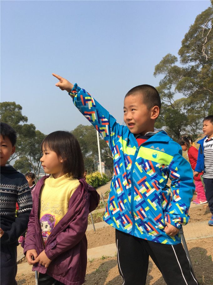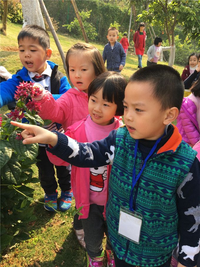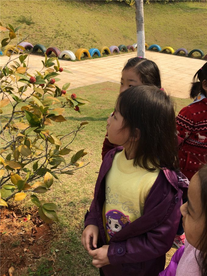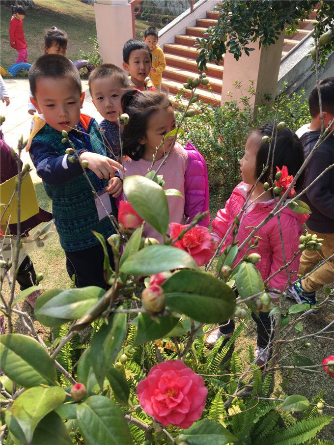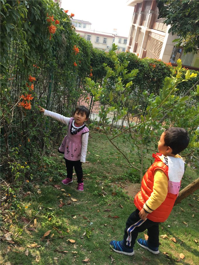 孩子们一来到就山坡就直奔开心农场,贝贝很是激动地指着泥土说:“我发现了,春天是脏脏的泥土”。这时,对面的天天笑眯眯地指向天空说:“老师,春天是金金的黄色!”琳琳指着远处的栅栏上开着娇艳的炮仗花说:“老师,我也发现春天的颜色?”“在哪里?”于是,孩子们又开始换地方寻找春天的色彩了!