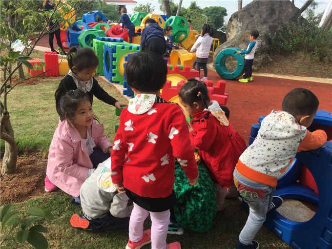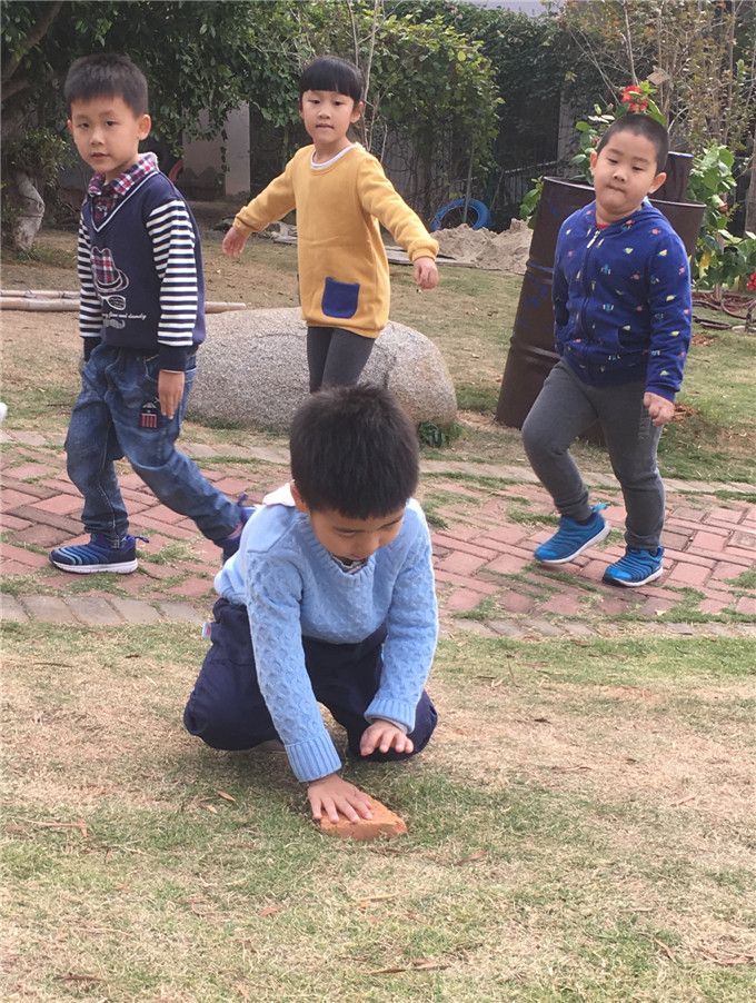 小山坡上有一两处下陷的小坑,小朋友看见了……“把这个竹蜻蜓插在上面,这样大家会发现这里有个小坑。”、“哦,这个小砖头刚好可以把这个小坑填平,这样会更安全些”、“这里还有一个小坑,一起把它堵上吧。”……