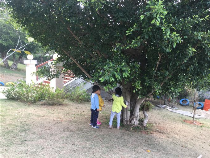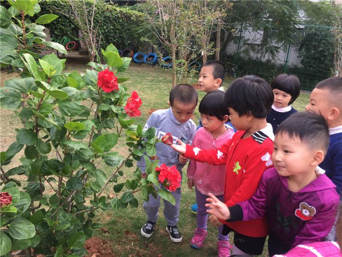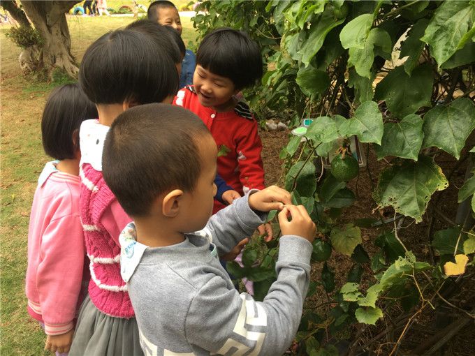坡底的百香果,枝叶茂密,果子悬挂下来,孩子们轻轻地摸着、闻着,叽叽喳喳聊了起来,聊着聊着,聊到了爬山虎的卷须,发现百香果和爬山虎一样都有很多卷须……扶桑花有的开得正艳,有的开始凋谢了,孩子们担心地问:凋谢了会怎么样?知道会落到地里化成肥料,悄悄地松了一口气……