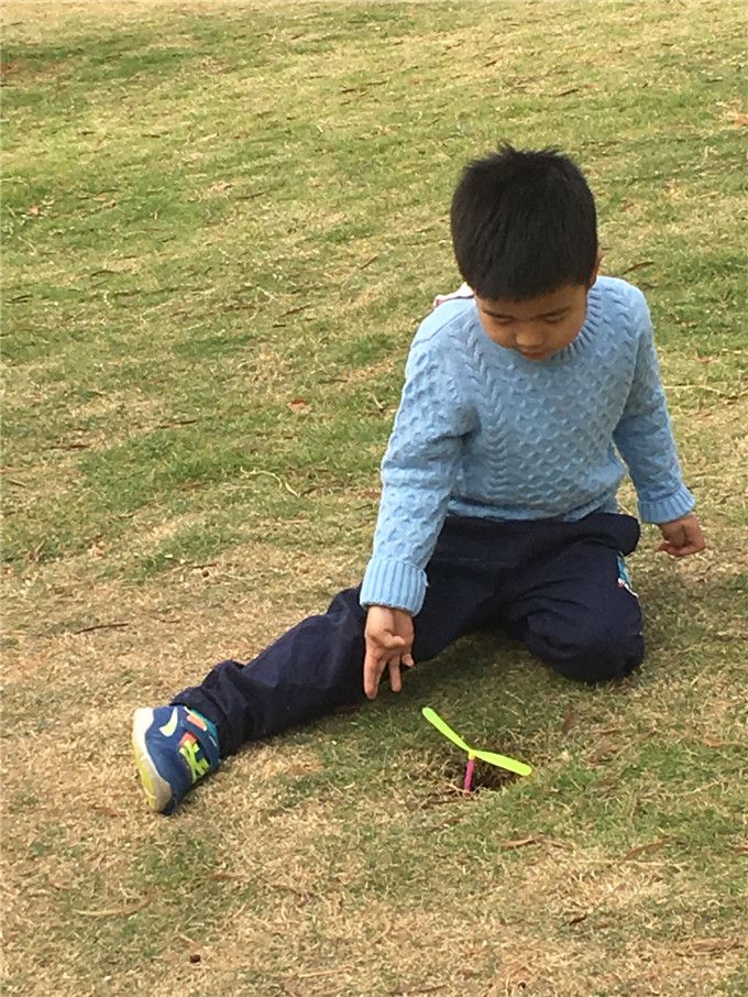 “竹蜻蜓挂在树上了,怎么办呢?”、“太高了,够不着”、“从这里爬,爬不上去的”、“我们用竹梯试试吧”,于是,在老师的协助下,挂在树上的竹蜻蜓被顶了下来,孩子们的脸上挂满了成功的喜悦.