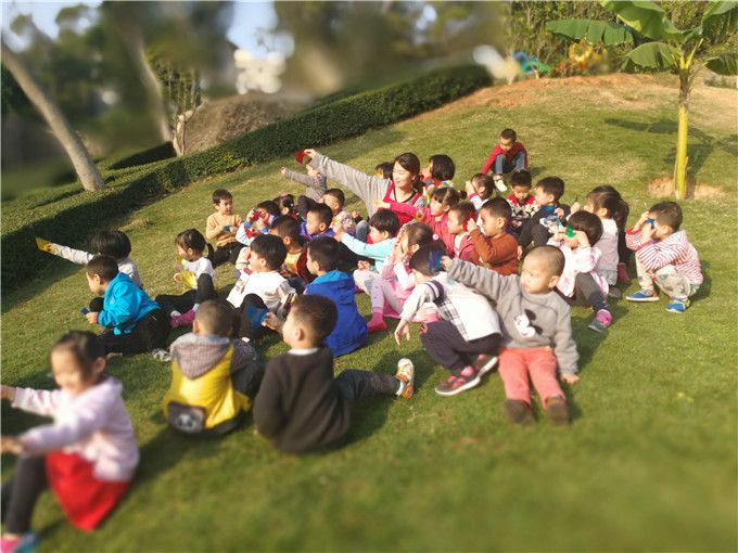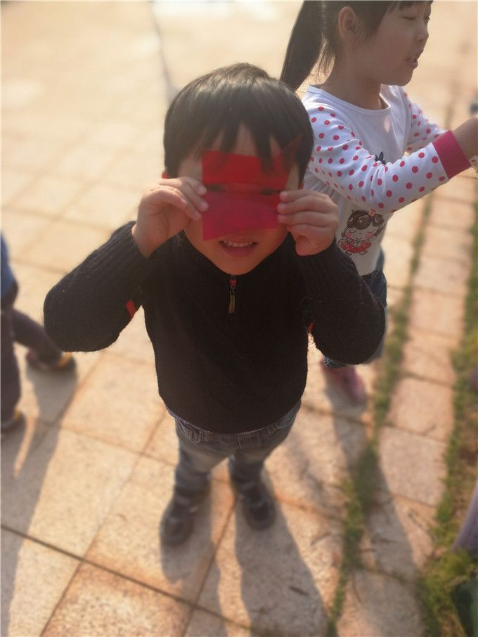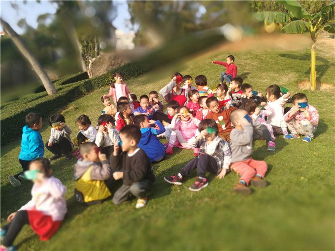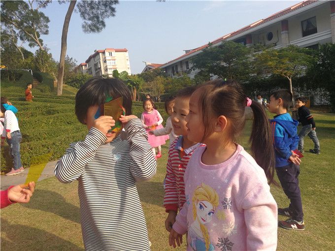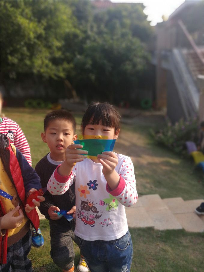 老师和孩子们围坐在青青的草地上,互相分享着自己发现的小秘密,“快看那,双子塔变成了红色,黄色,绿色......”翔翔高兴的指着远处的高楼喊到。“我跟你说哦,我刚刚把我黄色的色片和佳宁蓝色的色片合起来看,所有的东西都变成绿色的了,好神奇啊。”思恩得意地说着。“我把黄色,绿色,蓝色,红色,紫色的色片叠在一起看,所有的都成黑色的啦!”安然也自豪的分享着自己的小发现。看着孩子们认真的模样真的好可爱啊!