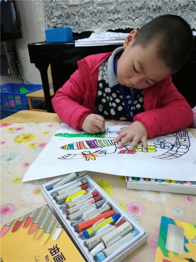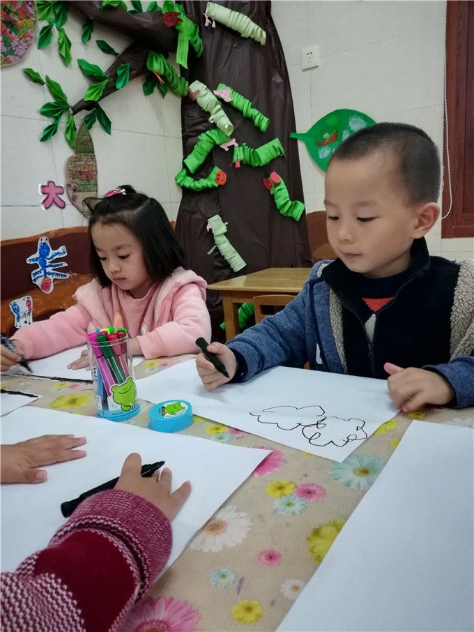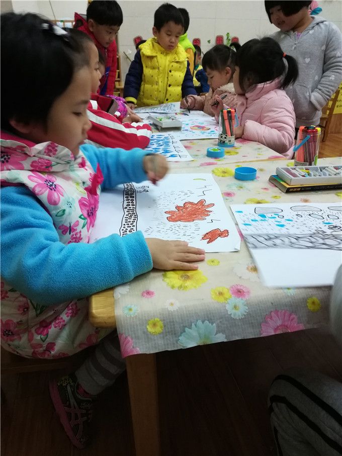 不一会儿萌娃就把绘画好的手稿涂上漂亮的颜色。“我想把雨伞画成五颜六色的,这样小伙伴们才能找到我”,“我要把雨点画小一点这样和伙伴在雨天散步就不会淋湿了”……我们真切地了解到在萌娃的绘画世界中的缤纷世界。