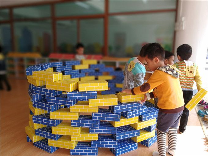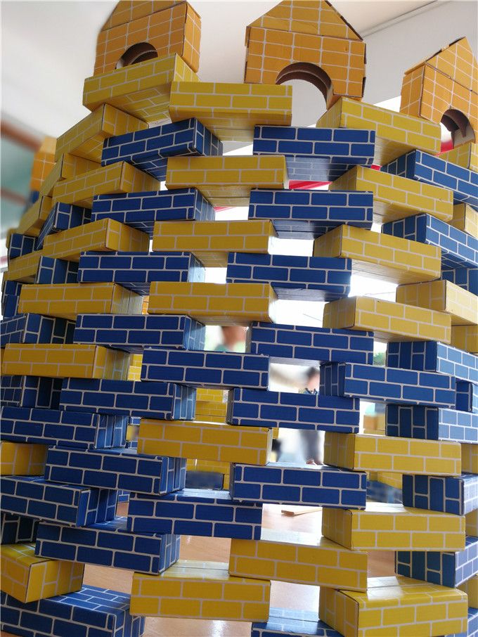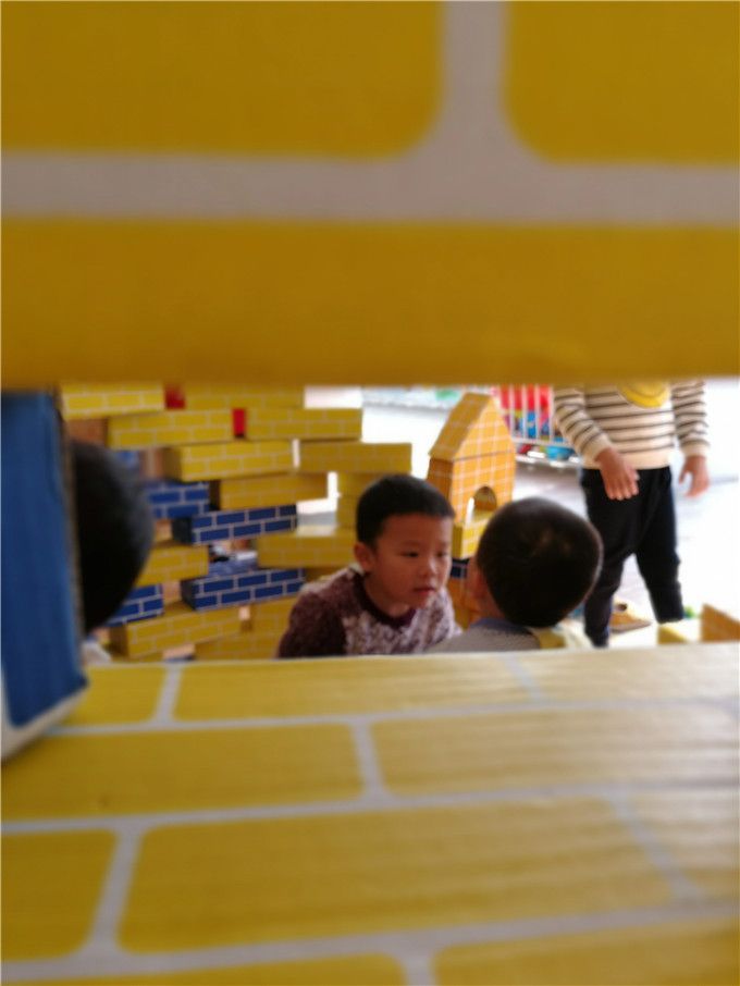 没过多久就看到一座座土楼的“地基”已经基本上成型了,蓝色和黄色搭建起来的土楼看上去相对于稳定一些,他们运用了镂空、叠高、链接等技能呢,厉害哦!快看,这边的孩子们竟然可以把积木竖起来,再这个基础上再加上积木,叠高,真有创意!