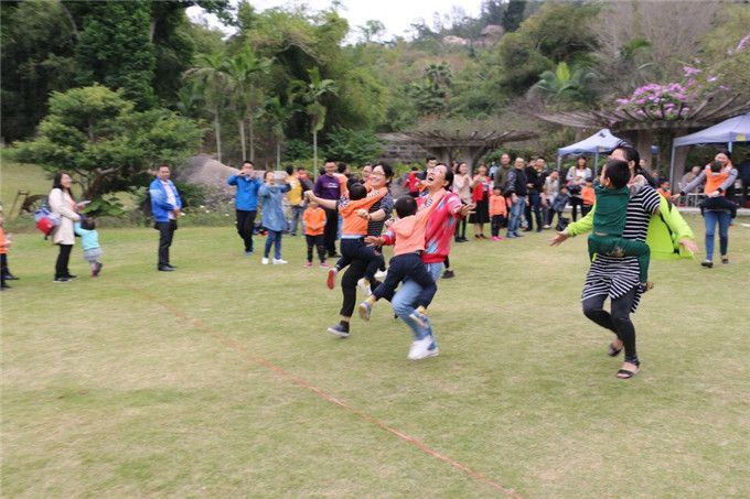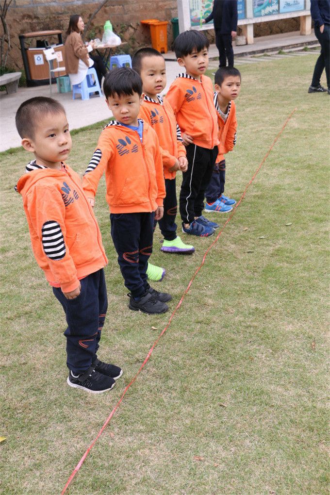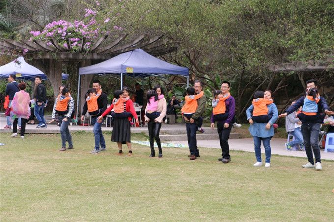 到达蔷薇园后,本次户外活动的重头戏正式登场。首先举行的是“袋鼠跳跳跳”。在张老师的带领下,小朋友们分为四组进行的比赛。该项目每个家庭派出一位宝宝和一位家长,让宝宝双手勾住家长的脖子,双脚缠在家长腰间,家长双手不能触碰孩子任何部位,一起跳完10米的路程,宝宝不掉下来且先到达的获胜。随着欢呼声的此起彼伏,该项目顺利完成。