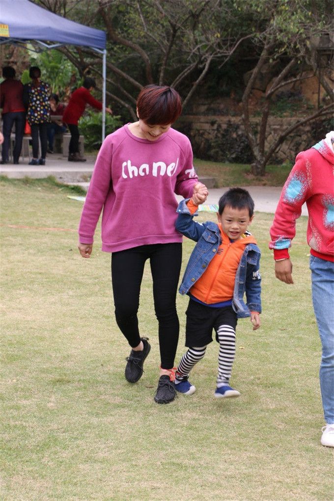 接下来的是“两人三足走”。该项目同样要求每个家庭派出一名宝宝和一名家长,将家长的一只腿和宝宝的一只腿绑在一起,不摔倒先走完预订路程的获胜。该项目又带来大家热情的放肆爆发。