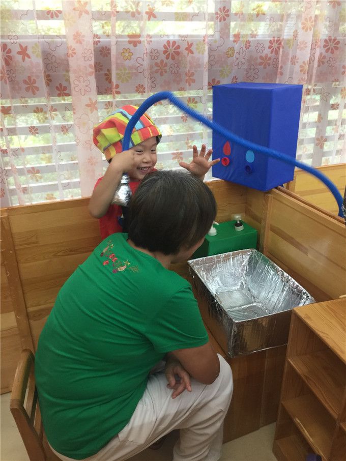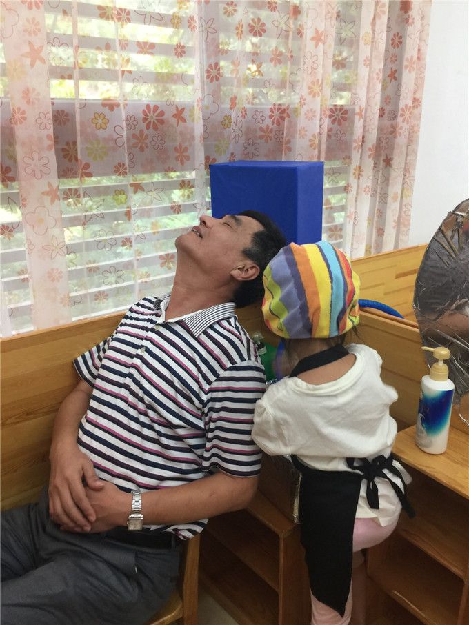 “爷爷,我给你洗头吧!不对不对,头要往后仰。”